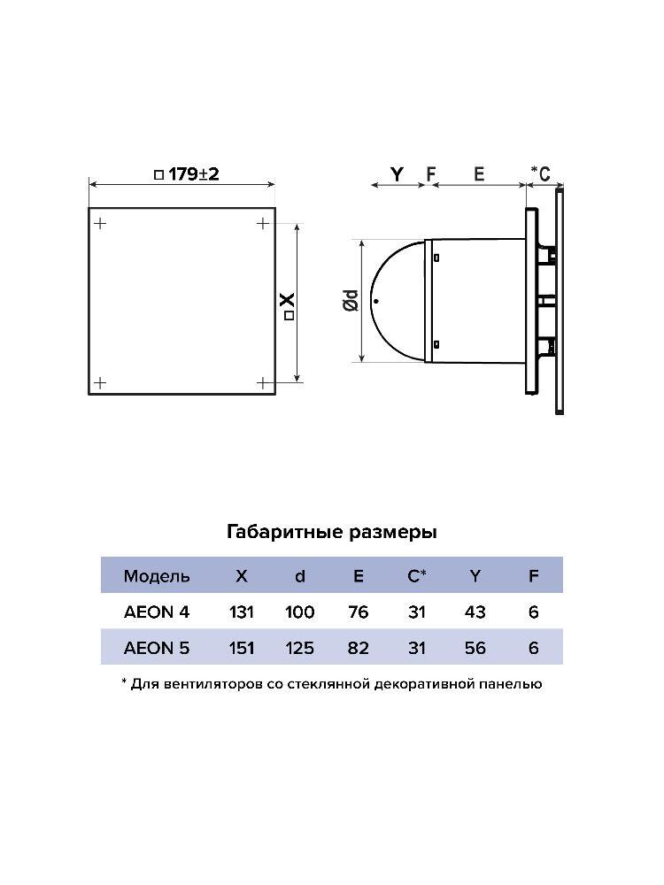 Декоративная панель из стекла с напылением подходит для всех моделей вентиляторов AEON. Стильная декоративная накладная панель позволяет интегрировать AEON в любой интерьер и обновлять его при желании, выбирая цвет панели из разнообразия вариантов. Для установки декоративной панели необходимо повернуть ее на 45°, затем прижать к лицевой панели вентилятора и еще раз повернуть на 45° по часовой стрелке. Таким образом декоративная панель будет надежно зафиксирована. В случае установки вентилятора в потолок необходимо закрепить лицевую панель снизу на корпусе саморезом (входит в комплект).