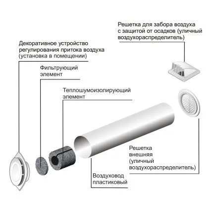 Клапан приточный состоит из пластикового воздуховода длиной от 0,5 до 1м, который монтируется в наружную стену здания. С уличной стороны он закрывается уличным воздухораспределителем.