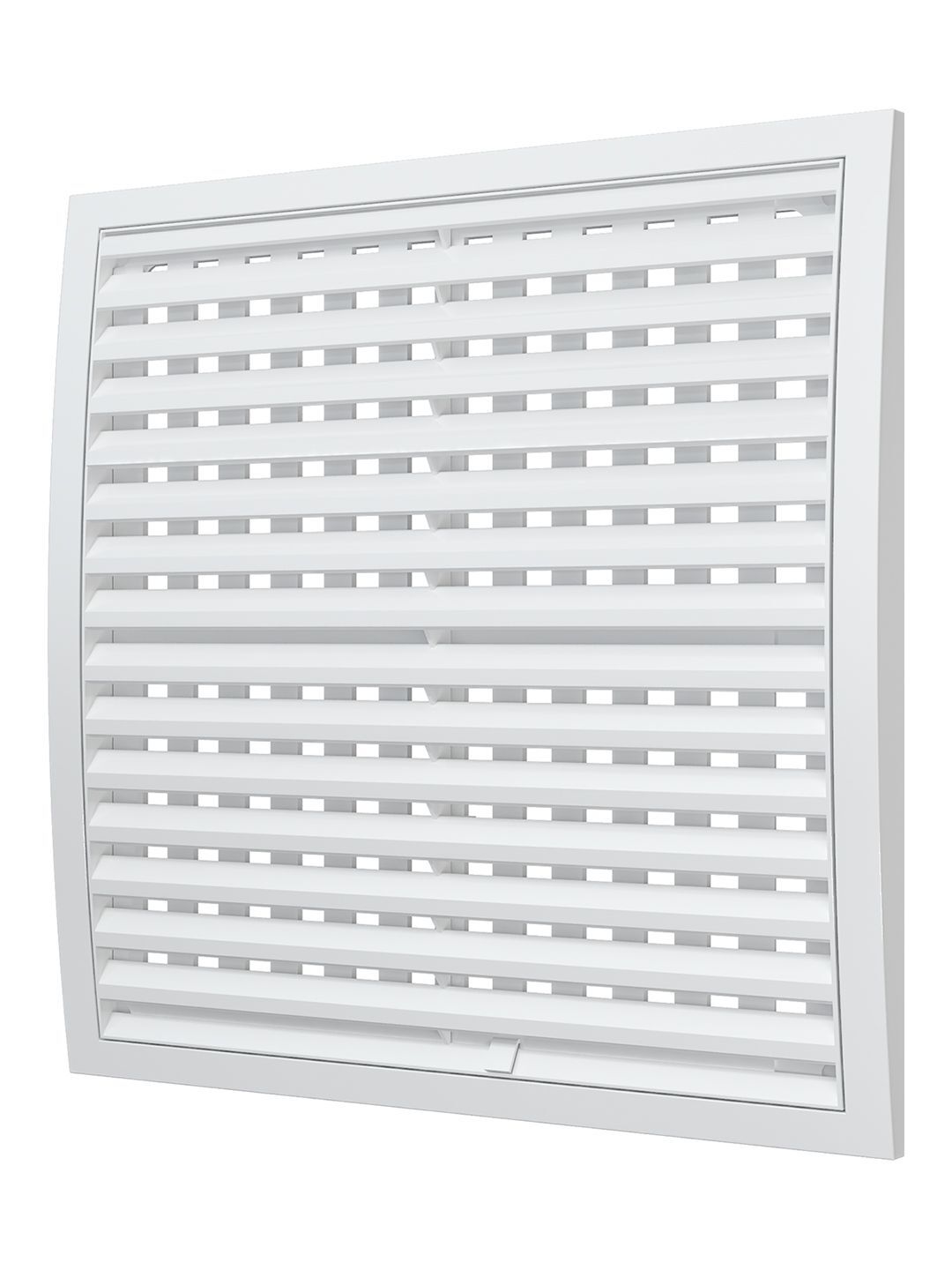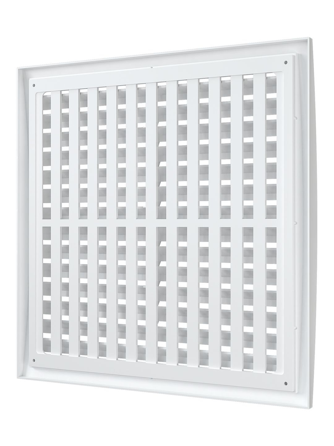 Разъемная решетка РРП оснащена подвижными частями для регулировки потока воздуха, нужное положение выбирается перемещением флажка. Наклонные жалюзи скрывают шахту вентиляции и придают ей эстетичный вид. Доступна в белом цвете и Ivory.