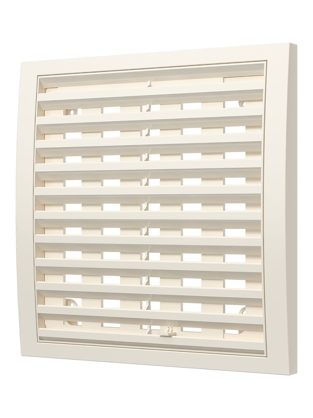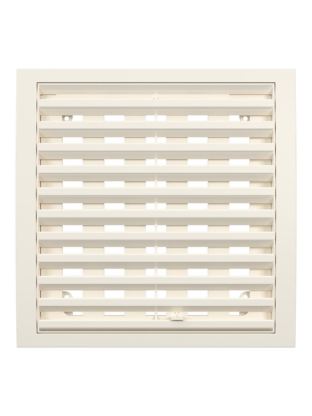 Разъемная решетка РРП оснащена подвижными частями для регулировки потока воздуха, нужное положение выбирается перемещением флажка. Наклонные жалюзи скрывают шахту вентиляции и придают ей эстетичный вид. Доступна в белом цвете и Ivory.