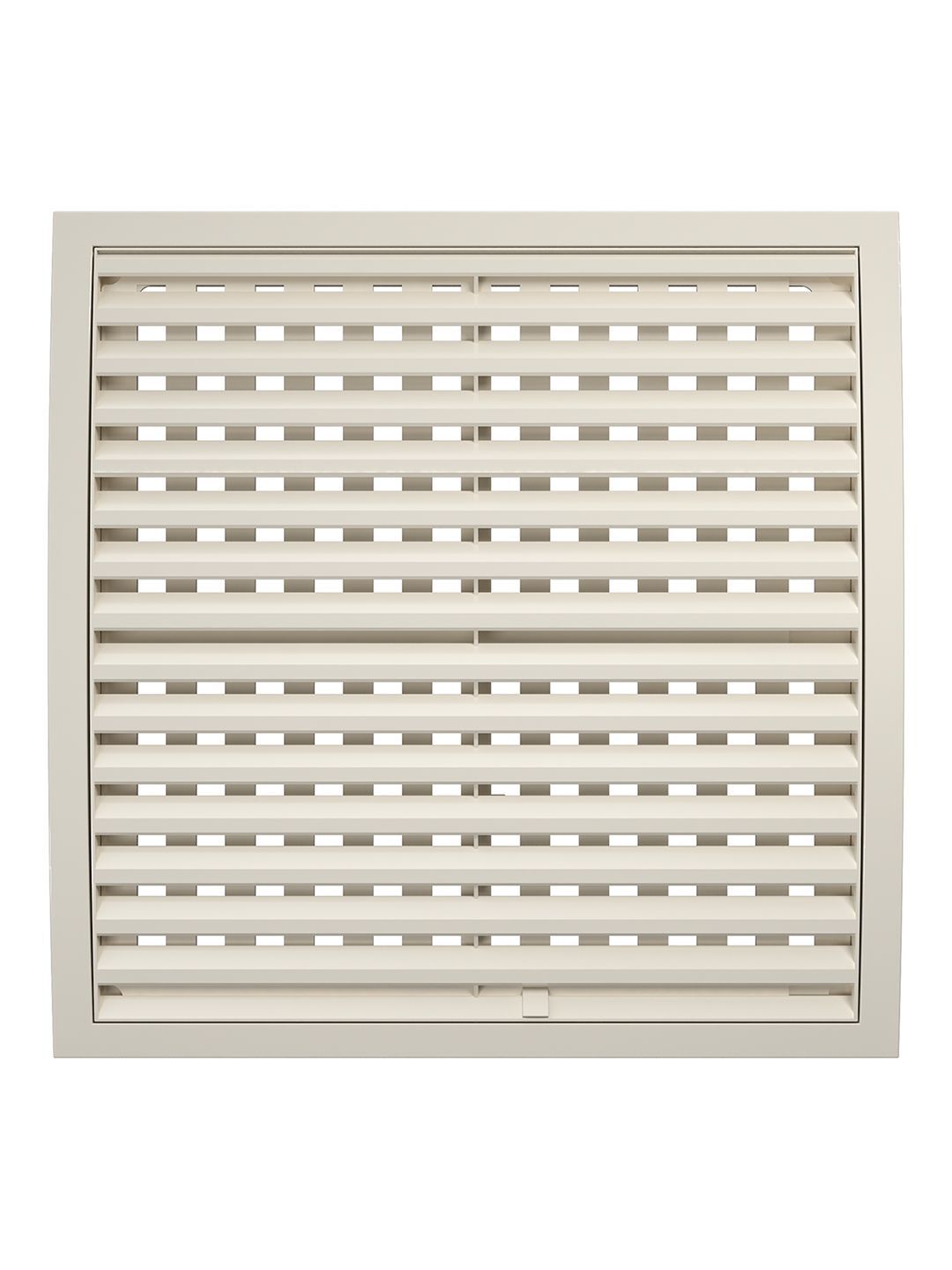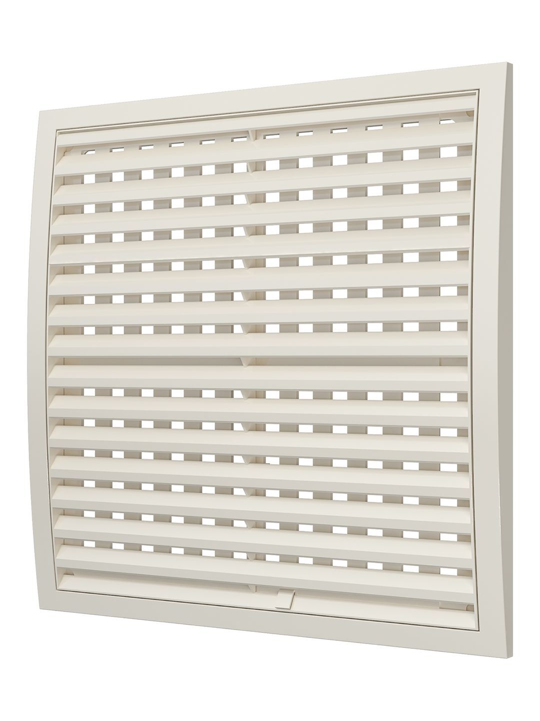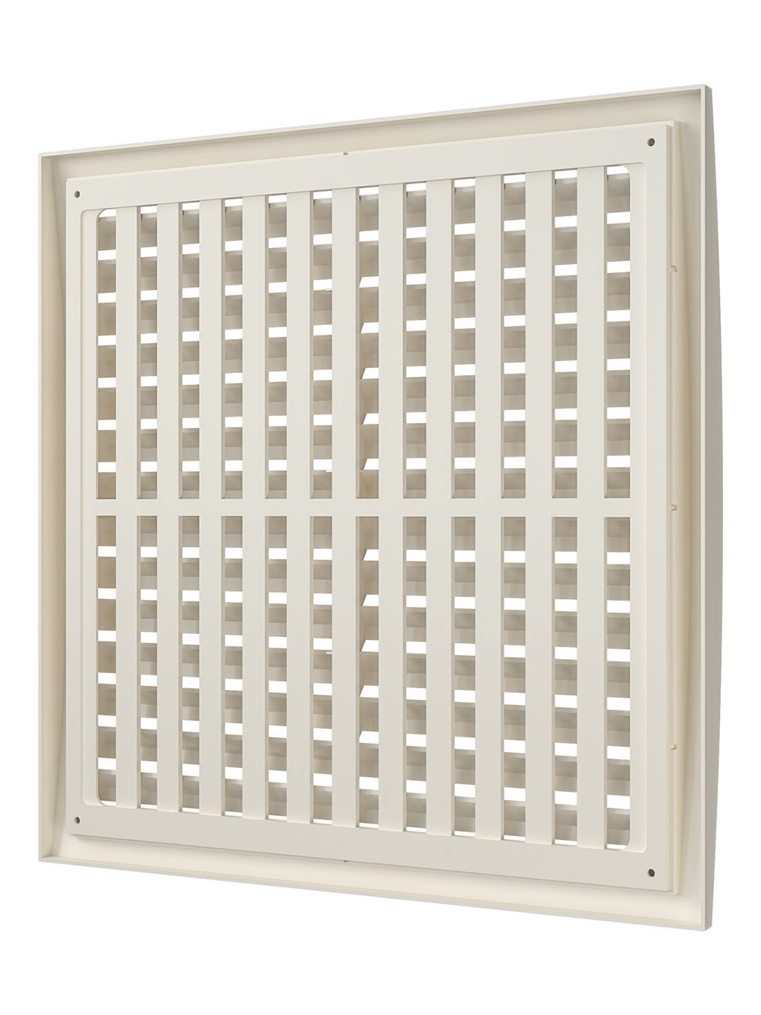 Разъемная решетка РРП оснащена подвижными частями для регулировки потока воздуха, нужное положение выбирается перемещением флажка. Наклонные жалюзи скрывают шахту вентиляции и придают ей эстетичный вид. Доступна в белом цвете и Ivory.
