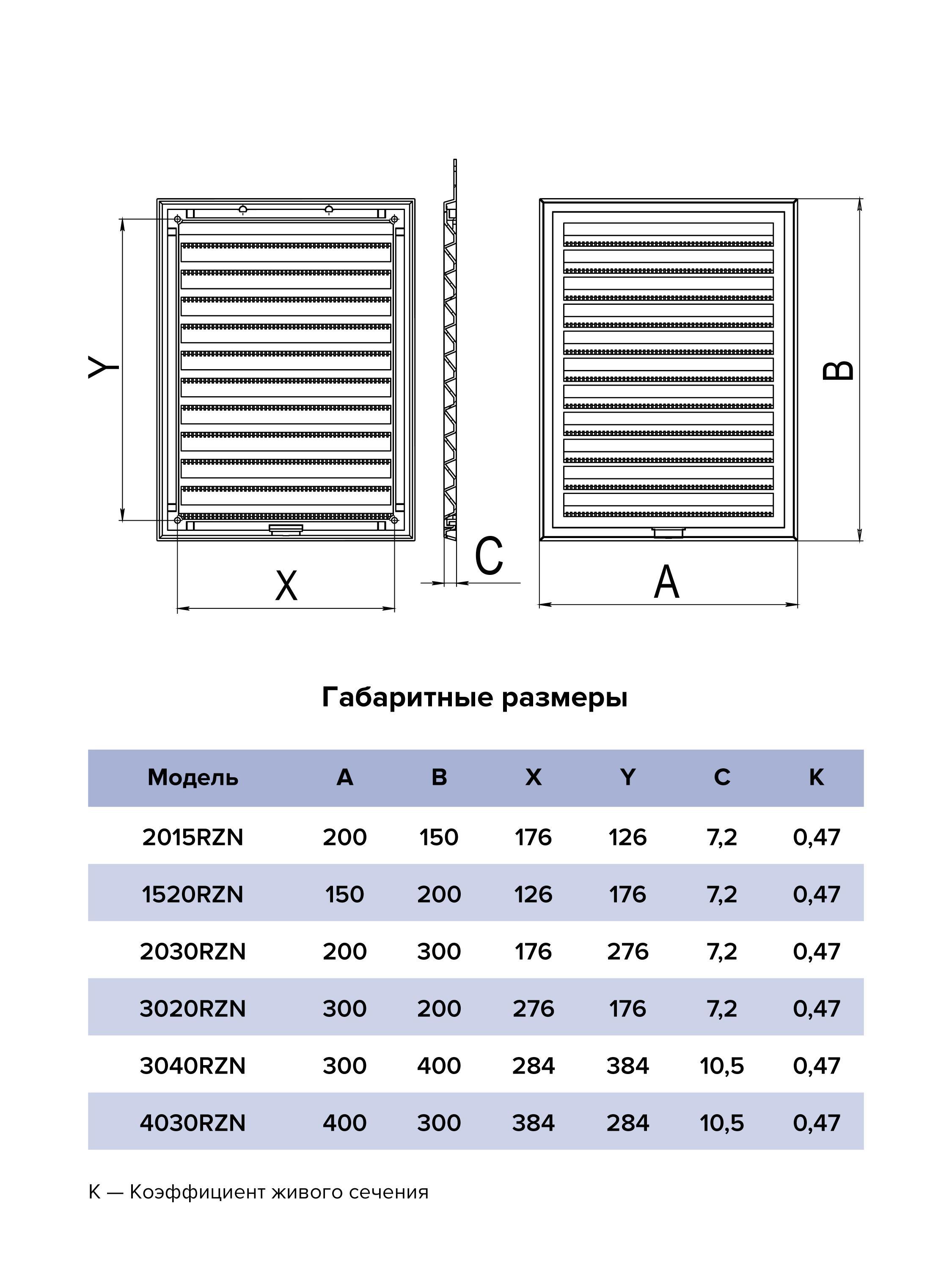Решетка предназначена для использования в приточно-вытяжной системе вентиляции. Изготовлена из качественного пластика. Конструкция решеток данной серии состоит из двух частей: рамы и жалюзи с пластиковой сеткой в изделиях с артикулами 1520RZN, 2015RZN, 2030RZN, 3020RZN; рамы и жалюзи с антимоскитной сеткой в изделиях с артикулами 3040RZN, 4030RZN. Решетка разъединяется путем отщелкивания пластикового фиксатора с помощью отвертки, что значительно упрощает ее ревизию.