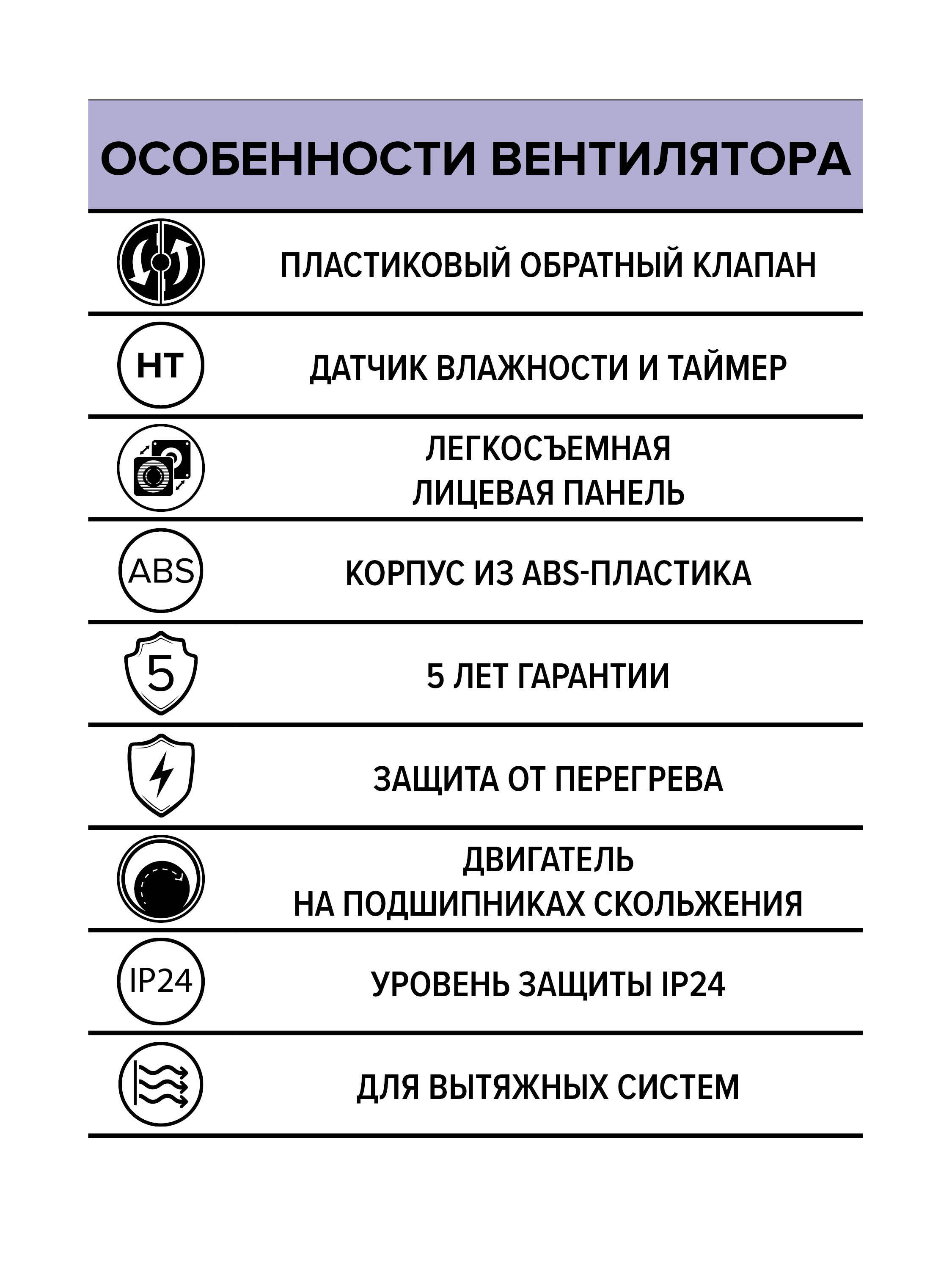 Двигатель на подшипниках скольжения;ABS-пластик;Защита от перегрева;5 лет гарантии;Защита от мелких частиц и брызг воды;Монтаж с помощью саморезов;Легкосъемная лицевая панель