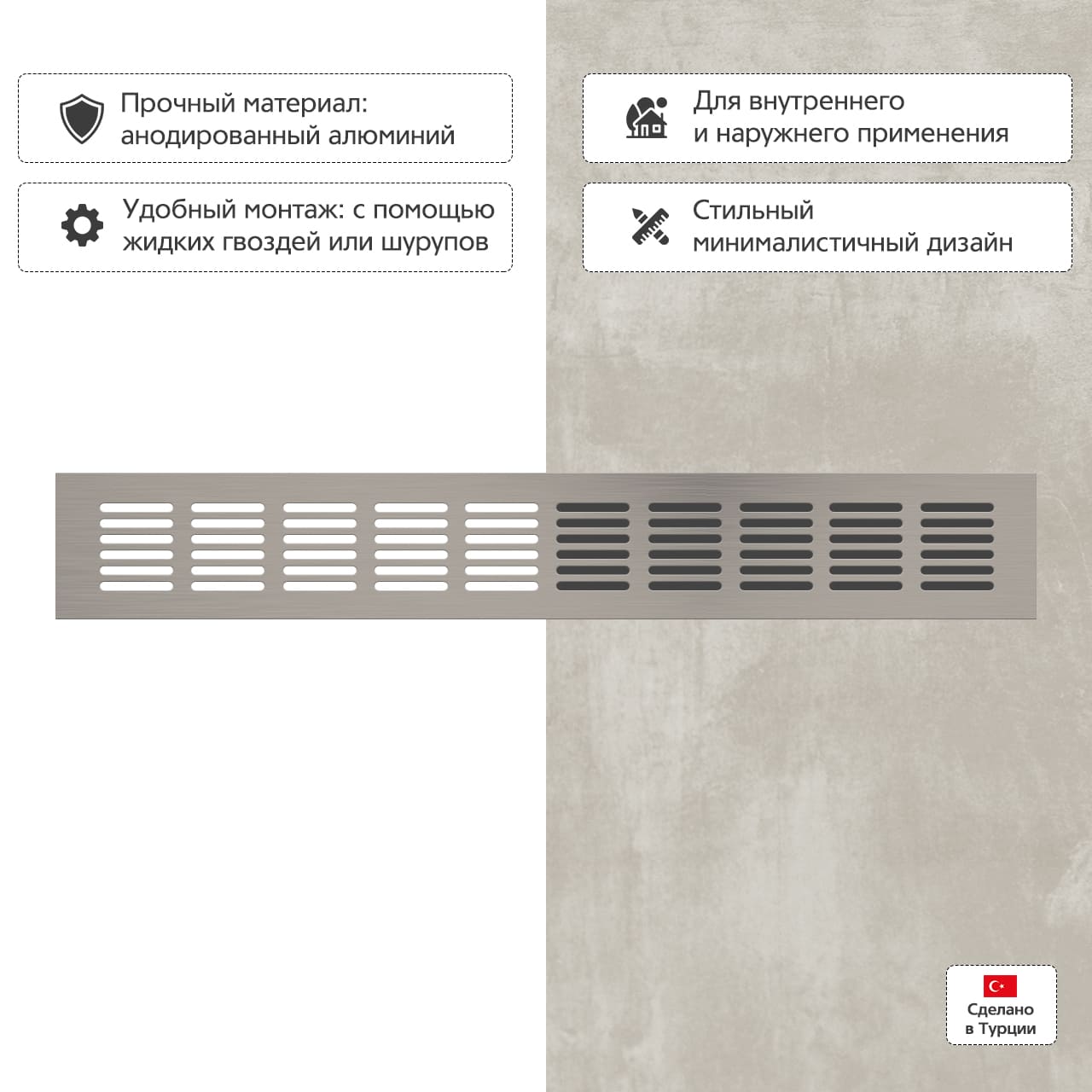 Вентиляционная решетка Благовест выполнена из высококачественного анодированного алюминия. Решетка является финальным элементом системы вентиляции, а также может использоваться для перетока воздуха между помещениями при установке в стену или дверь. Вентиляционная решетка также может быть установлена в мебельный цоколь (декоративную планку, закрывающую пространство под нижними мебельными модулями) или подоконник. Такой вариант использования вентиляционной решетки способствует правильной циркуляции воздуха под кухонными шкафами и другими предметами мебели и отводит тепло от встраиваемой техники.