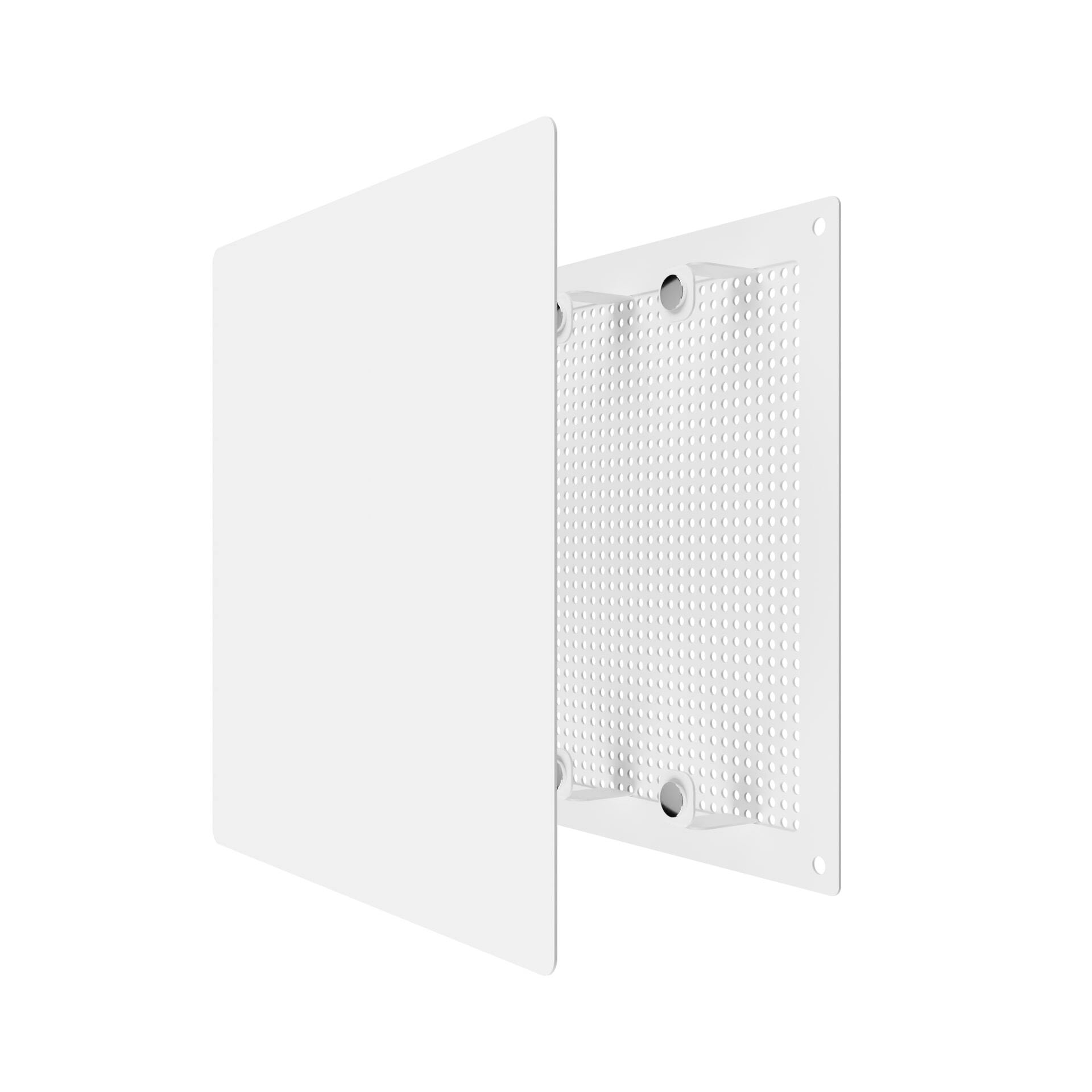 RVM состоит из двух частей. Рамка с сеткой и магнитами крепится к поверхности при помощи саморезов или клея, декоративная панель фиксируется на рамку с помощью магнитов, благодаря чему легко снимается для обслуживания решетки, скрывает вентиляционное отверстие и крепление рамки. За счет такой конструкции доступ воздуха в шахту не перекрывается и происходит его равномерное распределение.