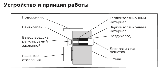 За счёт разницы в давлении воздушный поток с улицы по каналу в стене затягивается в помещение. Встроенная в клапан система шумоизоляции и фильтрации очищает воздух от пыли, пуха, насекомых и поглощает уличный шум. Клапан оснащен фильтром предварительной очистки класса G3, который не требует специального обслуживания.Устройство работает без электричества.
