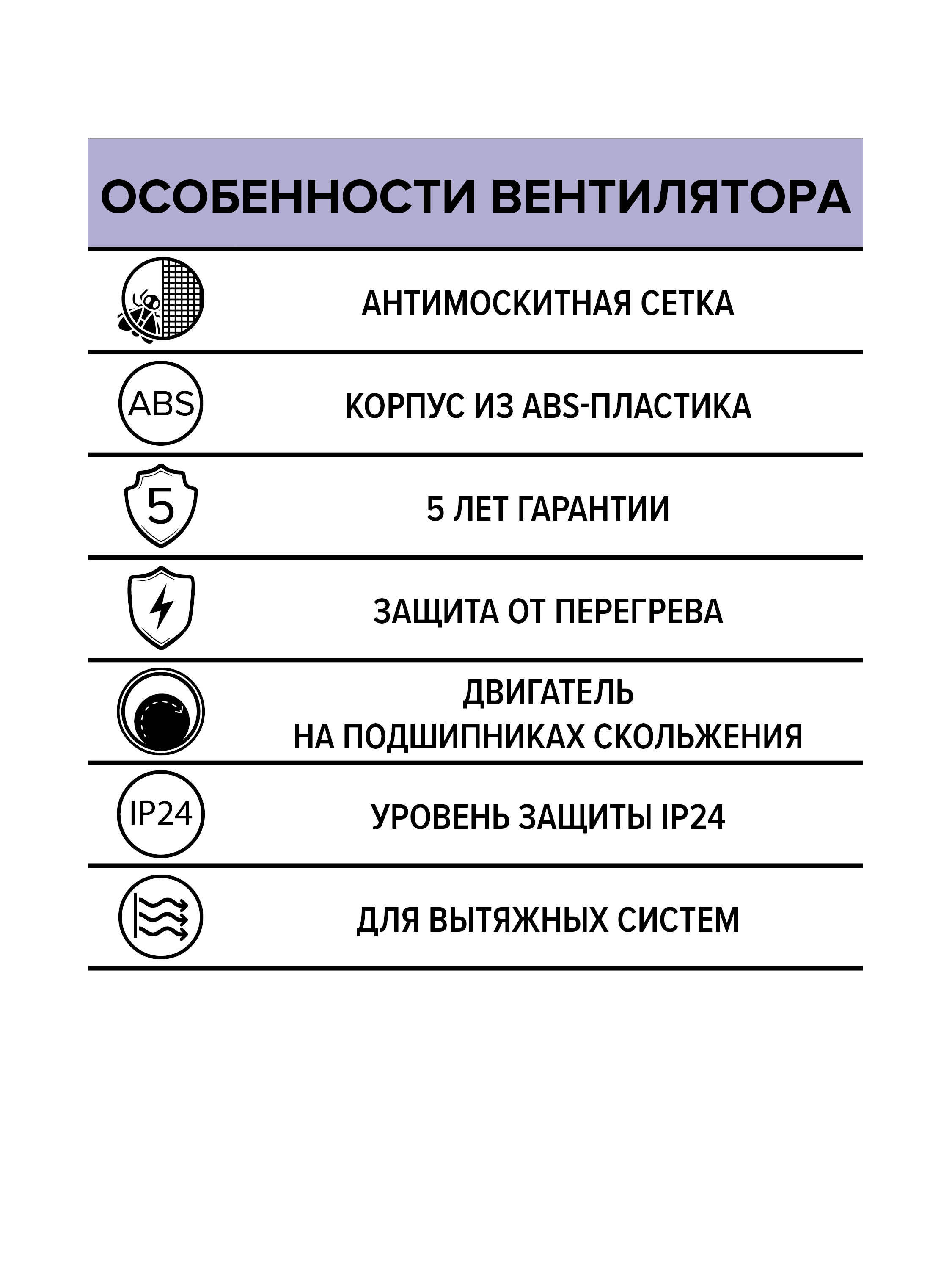 Двигатель на подшипниках скольжения;ABS-пластик;Защита от перегрева;5 лет гарантии;Защита от мелких частиц и брызг воды;Монтаж с помощью саморезов;Антимоскитная сетка