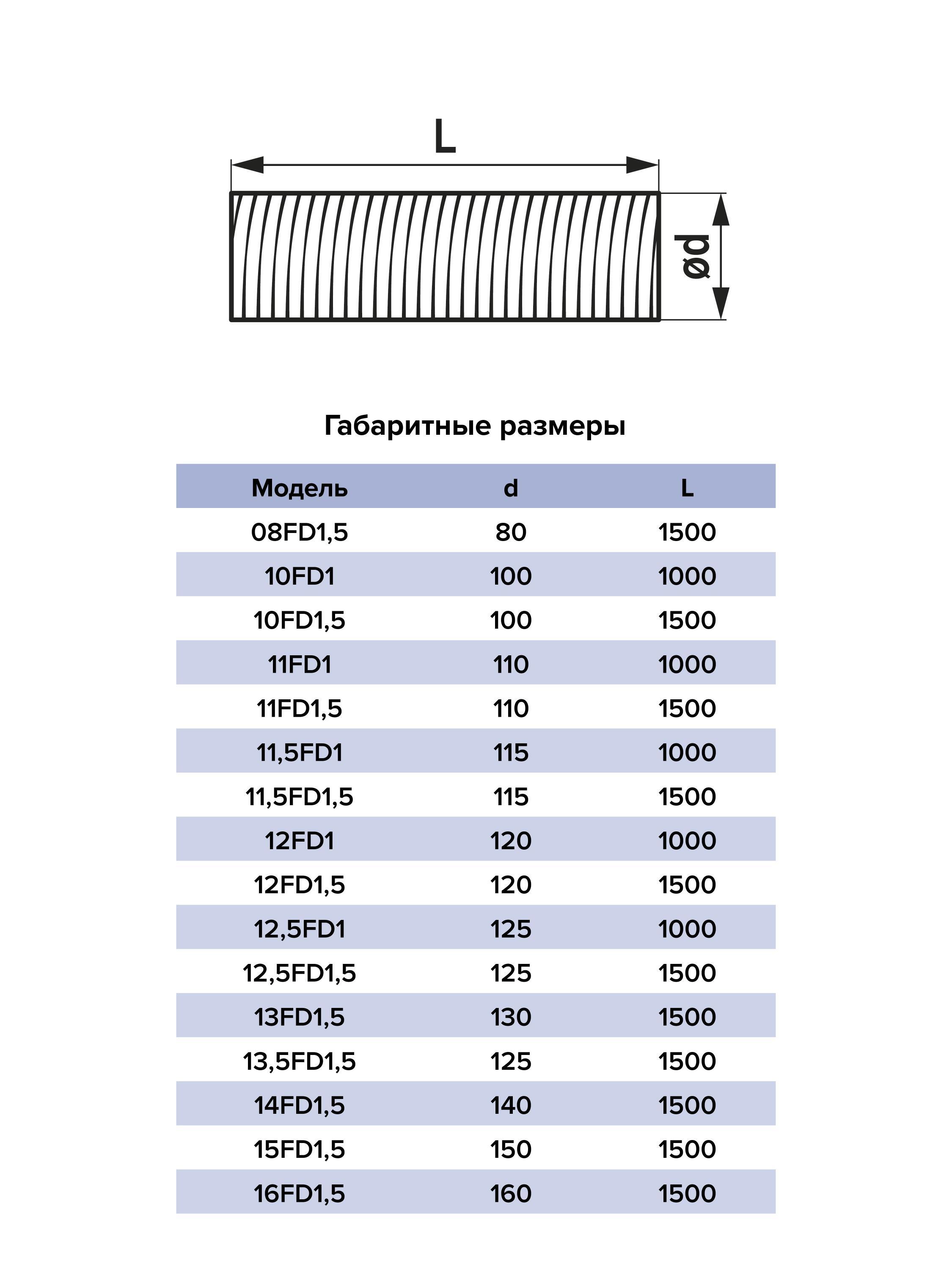 Гофрированные спирально-навивные воздуховоды FD необходимы для прокладки вентиляционного канала с удобным формированием углов и поворотов. Для простого соединения вытяжки с вентиляционной шахтой с минимальным набором фасонных элементов. Тип соединения: тройной замок. Материал: нержавеющая сталь AISI 304. Толщина: 80 мкм. Рабочая температура: -30 до +800 °С. Максимальная длина в растянутом виде: 2 м. Воздуховоды FD рассчитаны на минимальный изгиб.