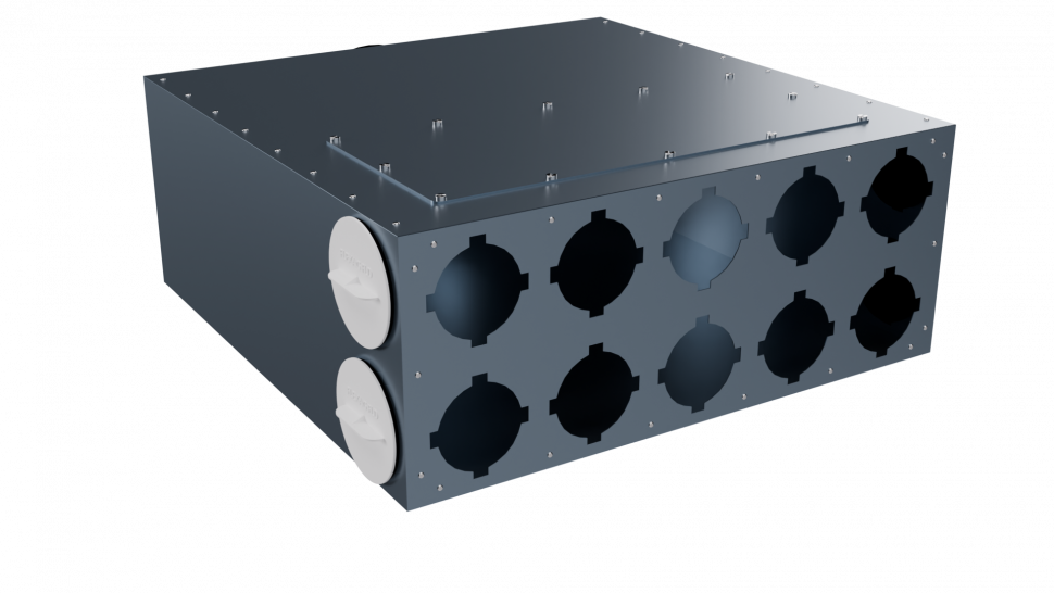 Коллектор воздухораспределительный CMP-FLD 200/75x10 предназначен для распределения воздушного потока в системе вентиляции на основе гибких воздуховодов Flexag диаметром 75 мм. Подающий вентиляционный канал диаметром 200 мм с уплотнительной резинкой разделяется на 10 каналов по 75 мм.