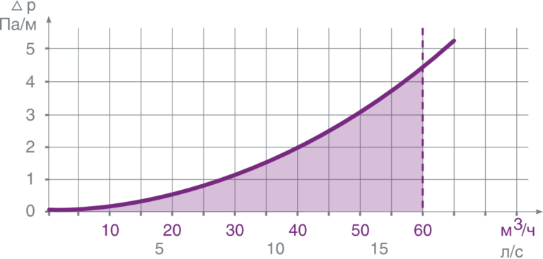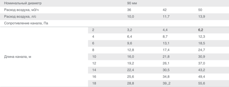 Ниже указаны проектные параметры скорости движения воздуха в канале, объем расхода воздуха и сопротивления канала в зависимости от его длины.