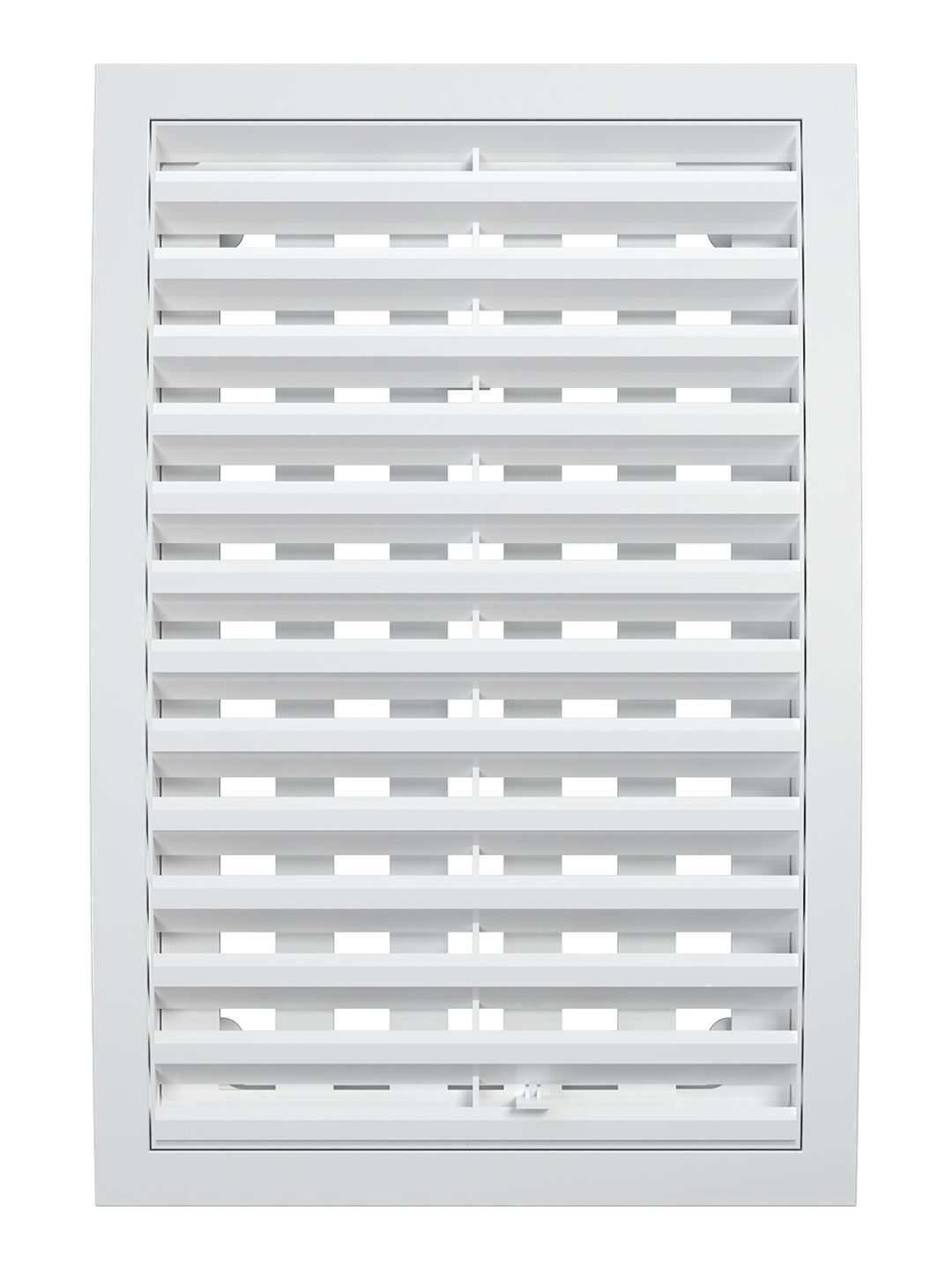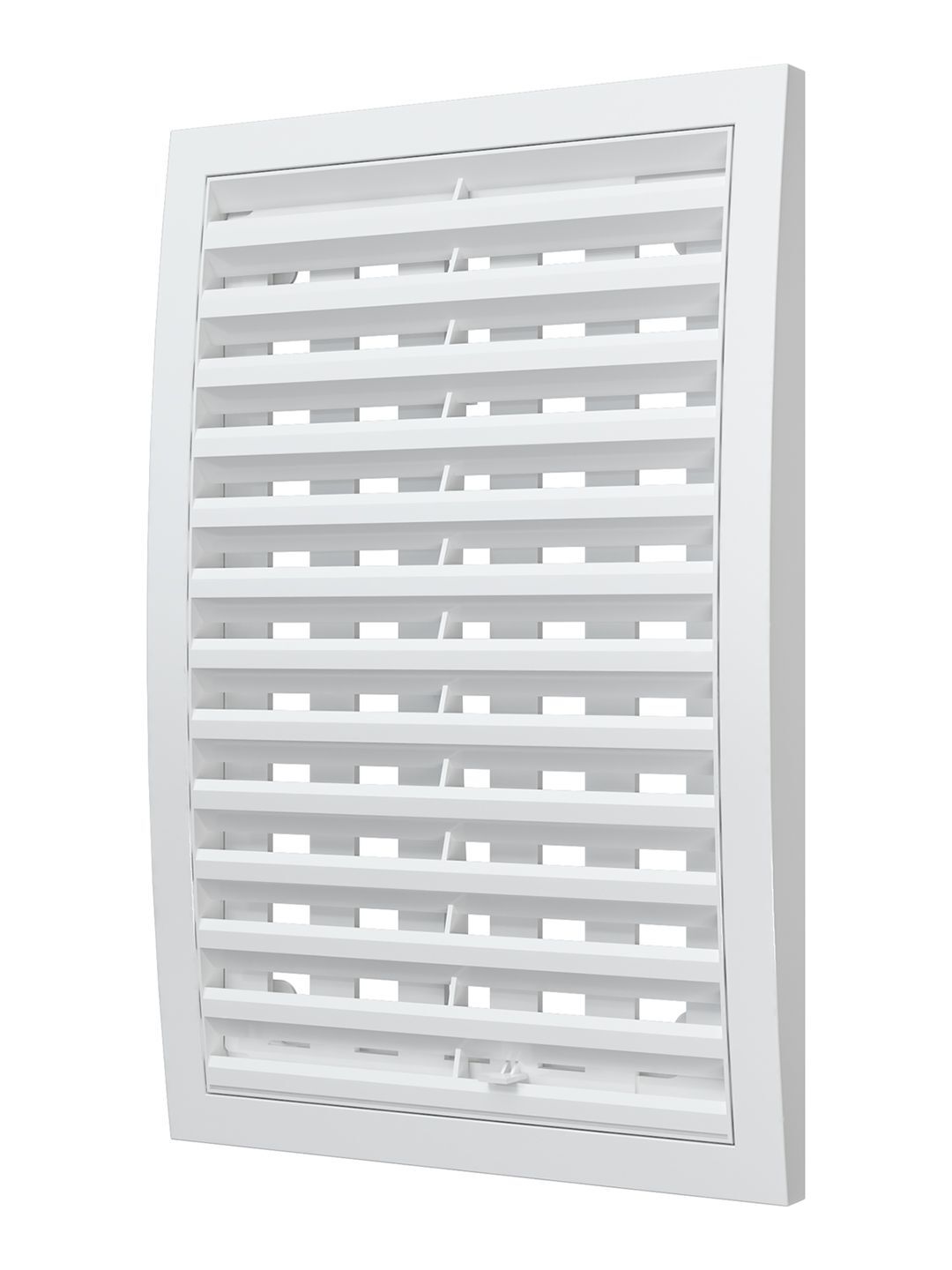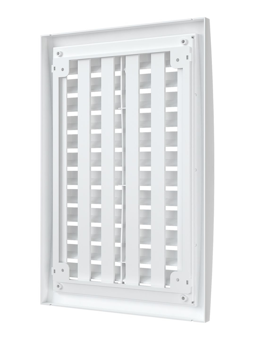 Разъемная решетка РРП оснащена подвижными частями для регулировки потока воздуха, нужное положение выбирается перемещением флажка. Наклонные жалюзи скрывают шахту вентиляции и придают ей эстетичный вид. Доступна в белом цвете и Ivory.