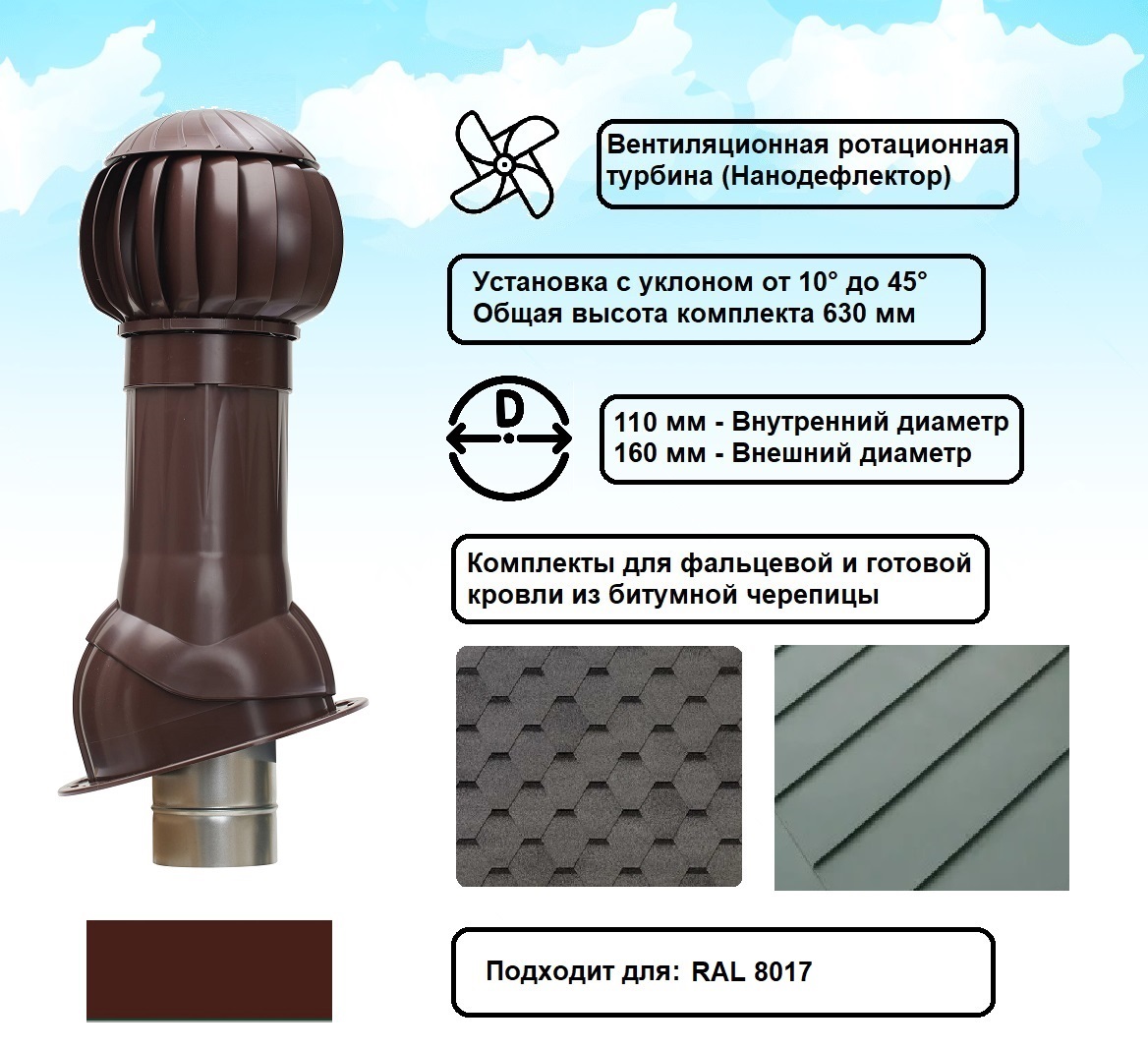 Готовый комплект, изолированный для фальцевой и готовой кровли из битумной черепицы d 110/160 мм, цвет коричневый RAL 8017, серия Twister