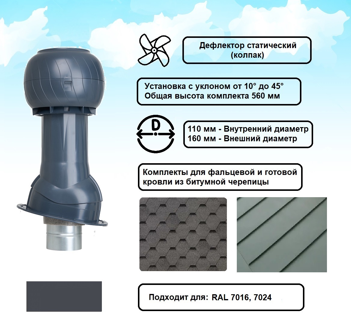Готовый комплект, изолированный для фальцевой и готовой кровли из битумной черепицы d 110/160 мм, цвет серый графит RAL 7024, серия Static