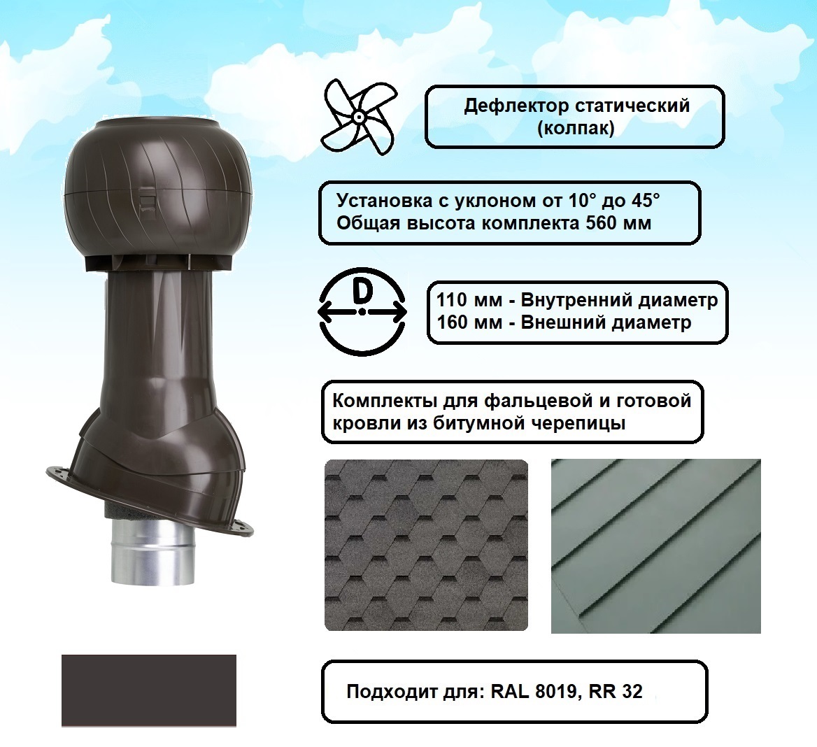 Готовый комплект, изолированный для фальцевой и готовой кровли из битумной черепицы d 110/160 мм, цвет темно-коричневый RAL 8019, RR 32, серия Static