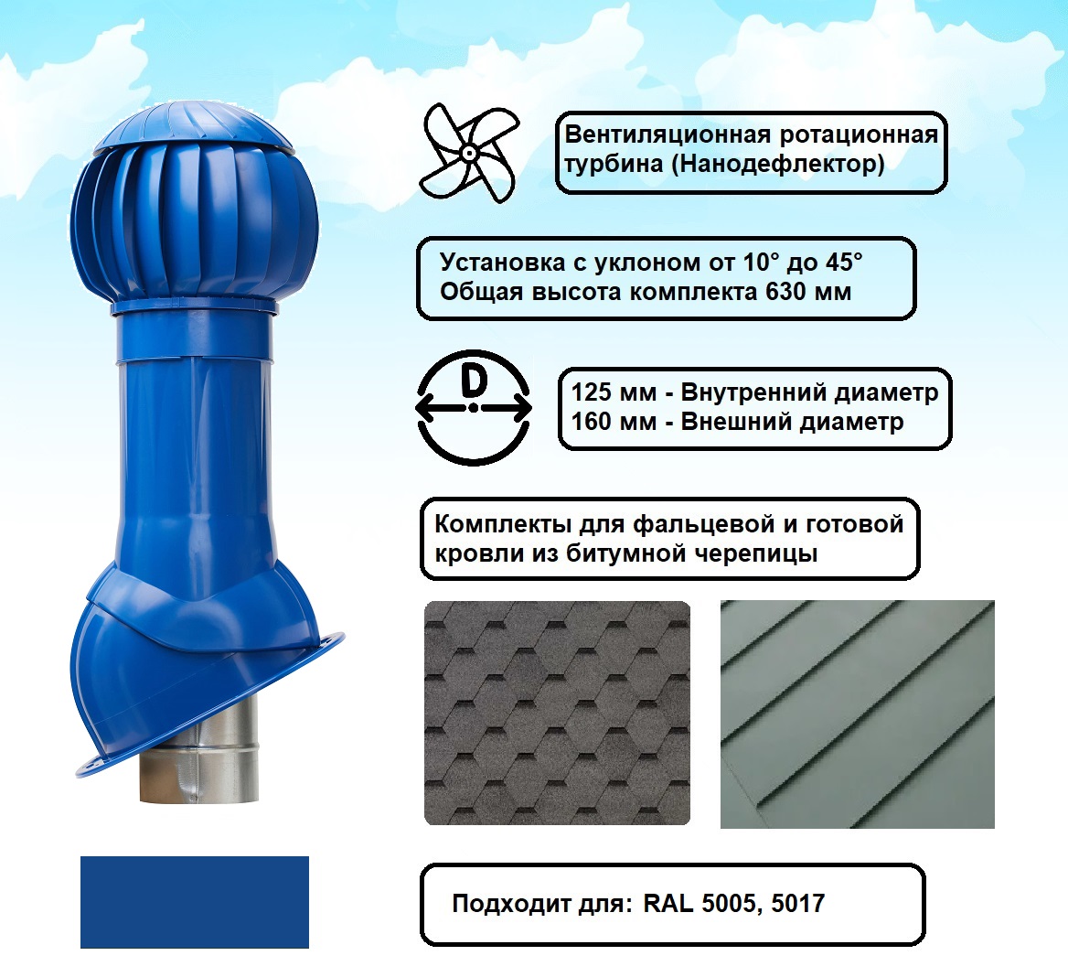 Готовый комплект, изолированный для фальцевой и готовой кровли из битумной черепицы d 125/160 мм, цвет синий RAL 5005, серия Twister