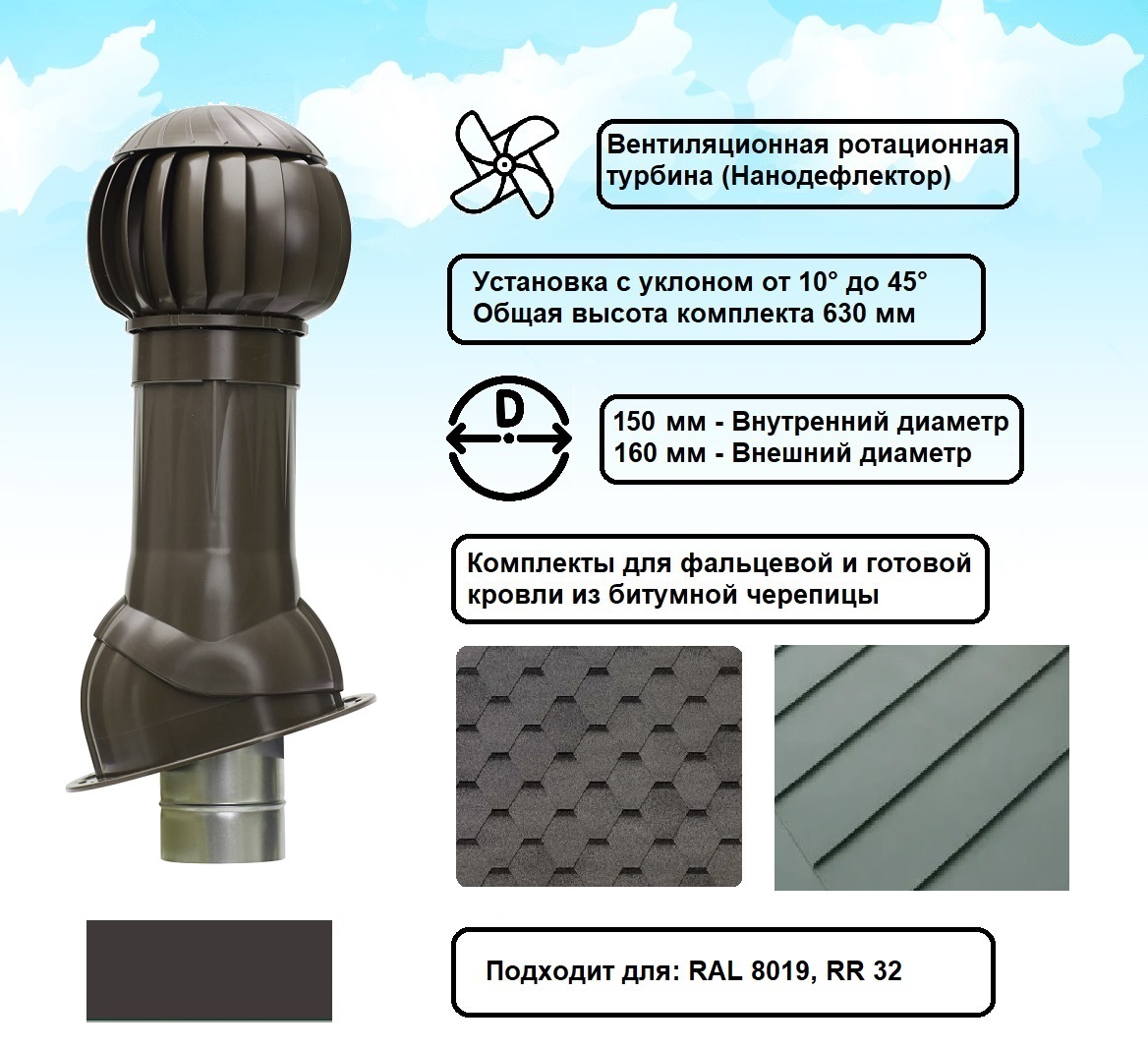 В комплект входит ротационная вентиляционная турбина 160 мм, вентиляционный выход изолированный и проходной элемент для фальцевой и готовой кровли из битумной черепицы.