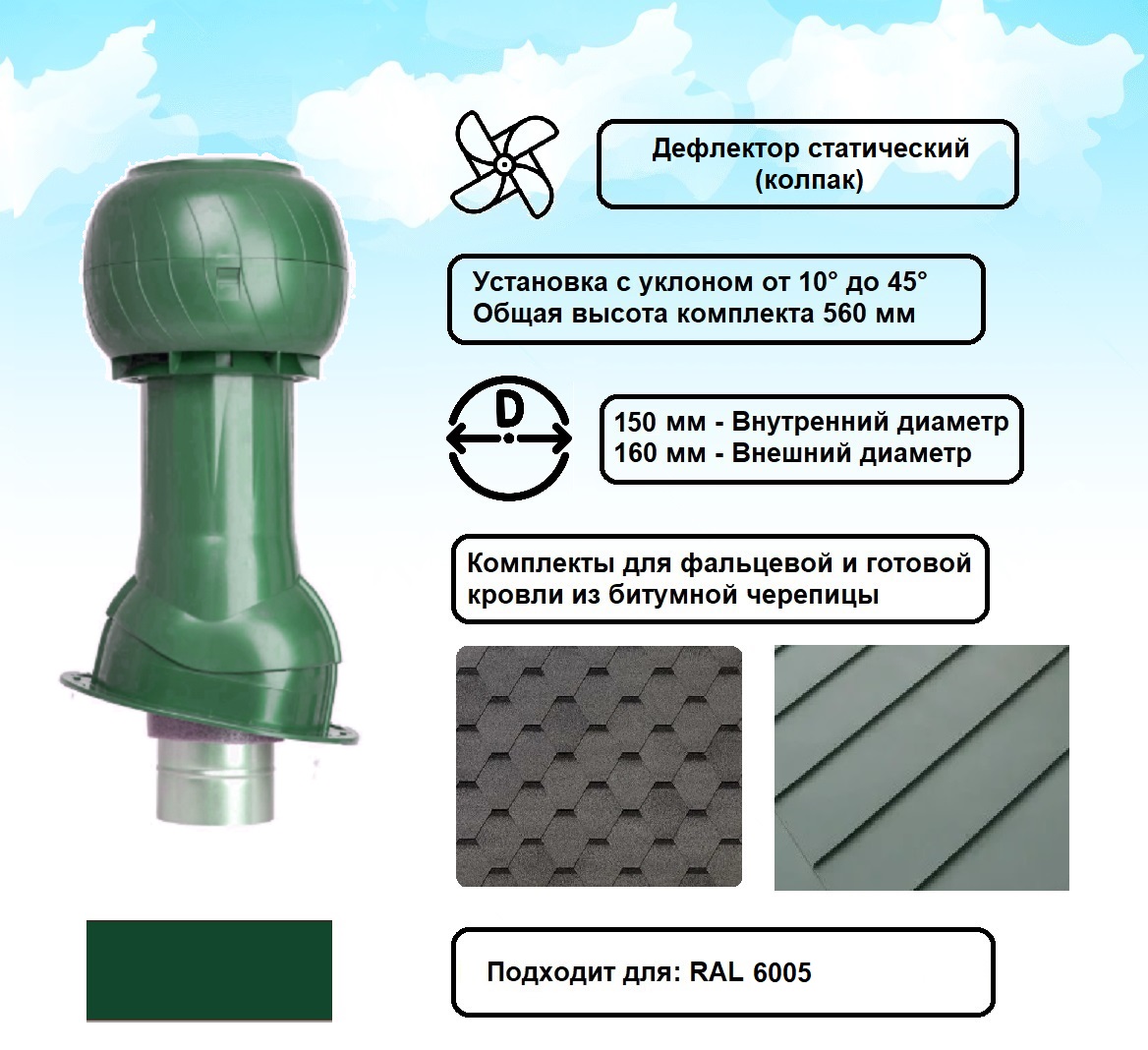 Готовый комплект, изолированный для фальцевой и готовой кровли из битумной черепицы d 150/160 мм, цвет зеленый RAL 6005, серия Static