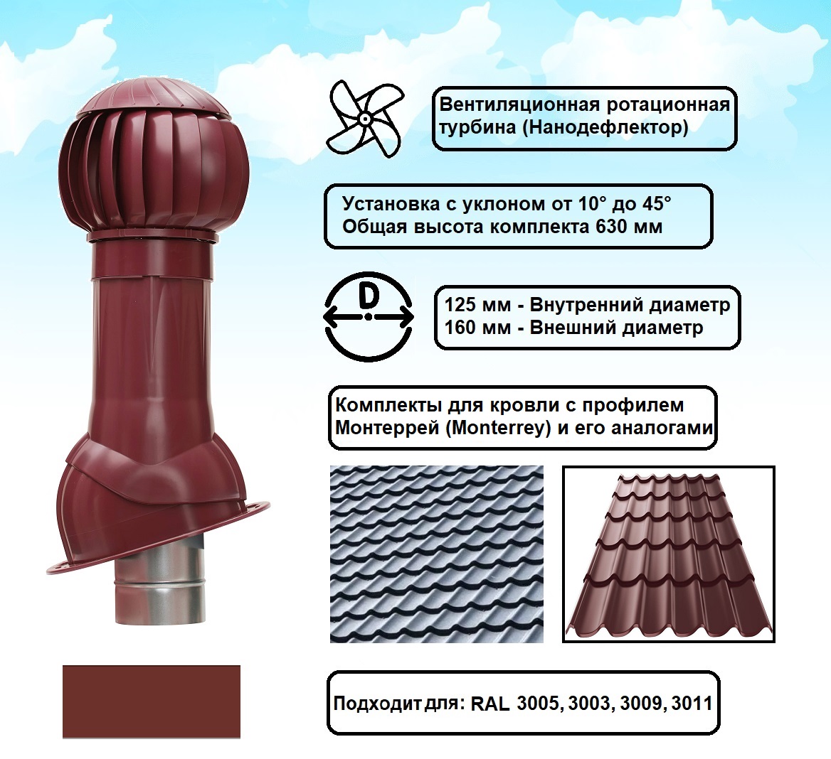 В комплект входит ротационная вентиляционная турбина 160 мм, вентиляционный выход изолированный и проходной элемент для кровли из металлочерепицы Монтеррей (Monterrey).