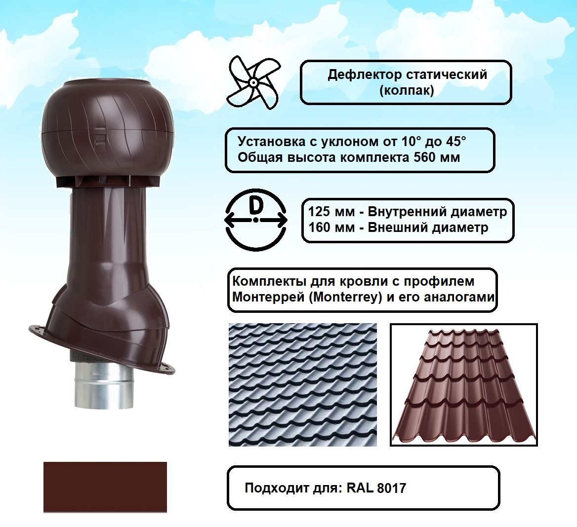 В комплект входит дефлектор статический (колпак вентиляционный) 160 мм (серия: Static), вентиляционный выход изолированный и проходной элемент для кровли из металлочерепицы Монтеррей (Monterrey).
