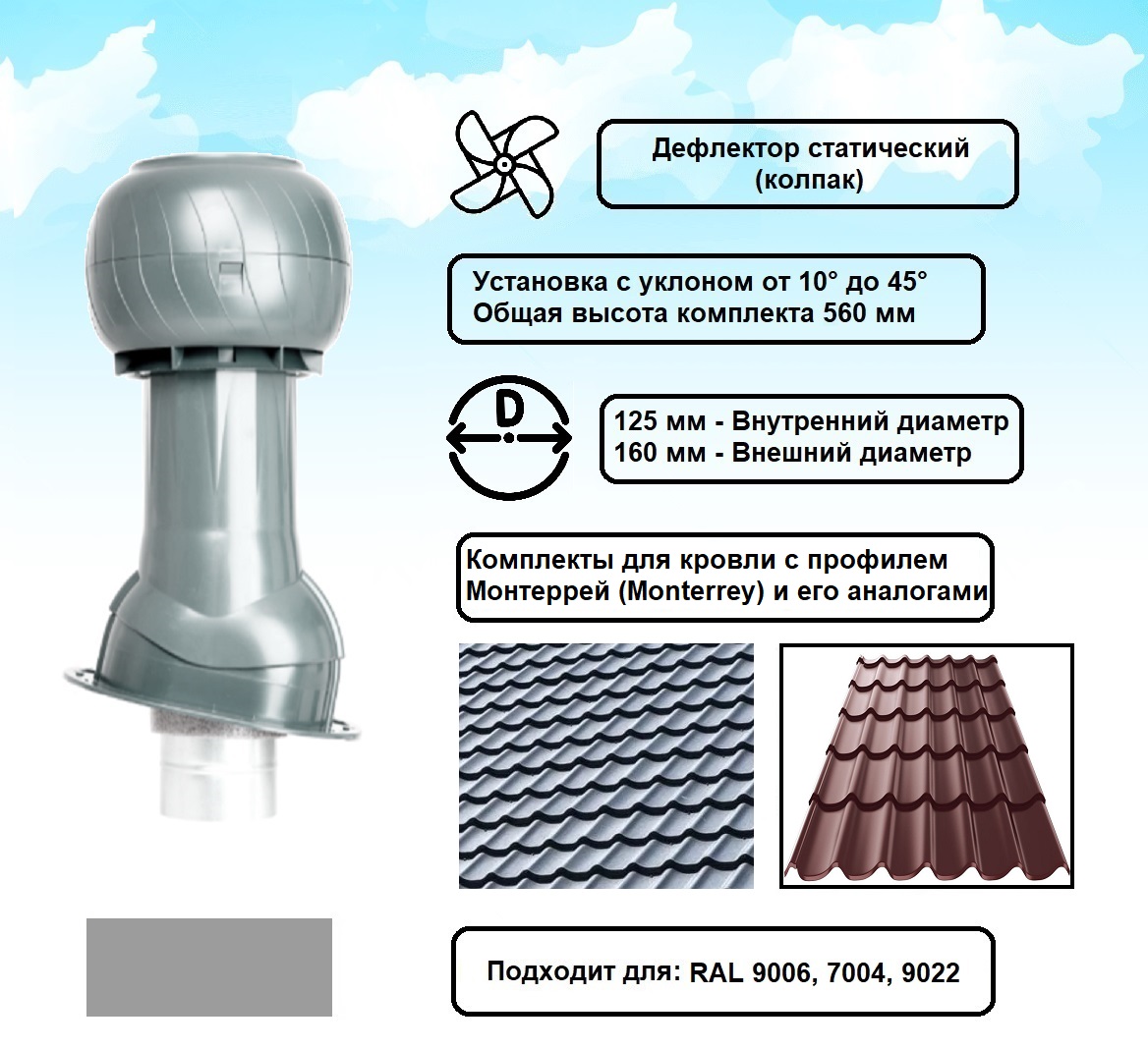 В комплект входит дефлектор статический (колпак вентиляционный) 160 мм (серия: Static), вентиляционный выход изолированный и проходной элемент для кровли из металлочерепицы Монтеррей (Monterrey).
