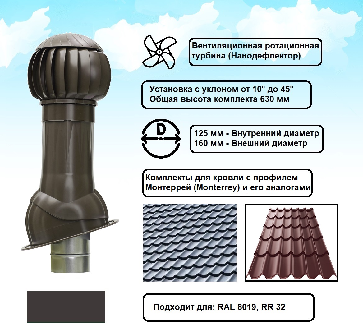 В комплект входит ротационная вентиляционная турбина 160 мм, вентиляционный выход изолированный и проходной элемент для кровли из металлочерепицы Монтеррей (Monterrey).