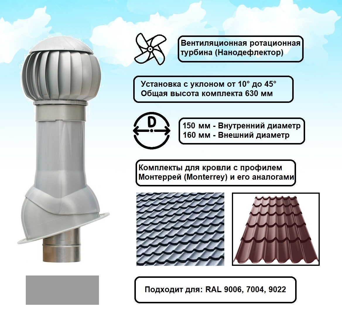 В комплект входит ротационная вентиляционная турбина 160 мм, вентиляционный выход изолированный и проходной элемент для кровли из металлочерепицы Монтеррей (Monterrey).