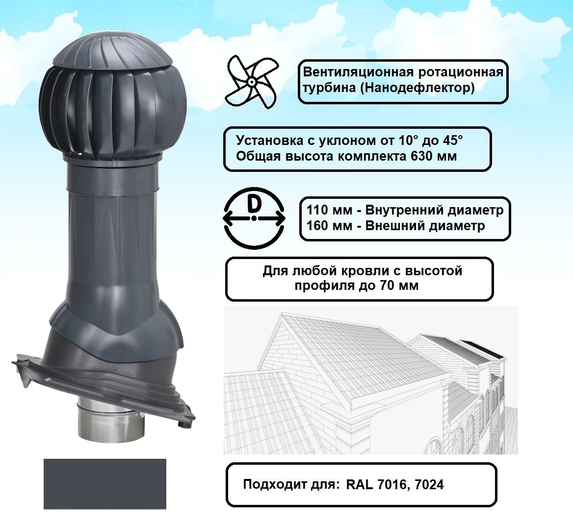 В комплект входит ротационная вентиляционная турбина 160 мм, вентиляционный выход изолированный и проходной элемент UNIVERSAL кровельный.