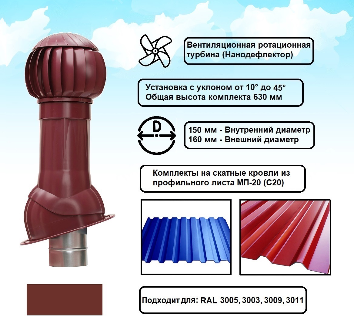 В комплект входит ротационная вентиляционная турбина 160 мм, вентиляционный выход изолированный и проходной элемент для кровли из металлопрофиля МП-20 (С20).