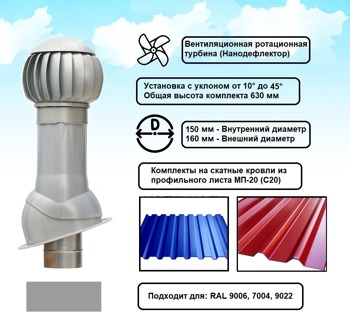 В комплект входит ротационная вентиляционная турбина 160 мм, вентиляционный выход изолированный и проходной элемент для кровли из металлопрофиля МП-20 (С20).