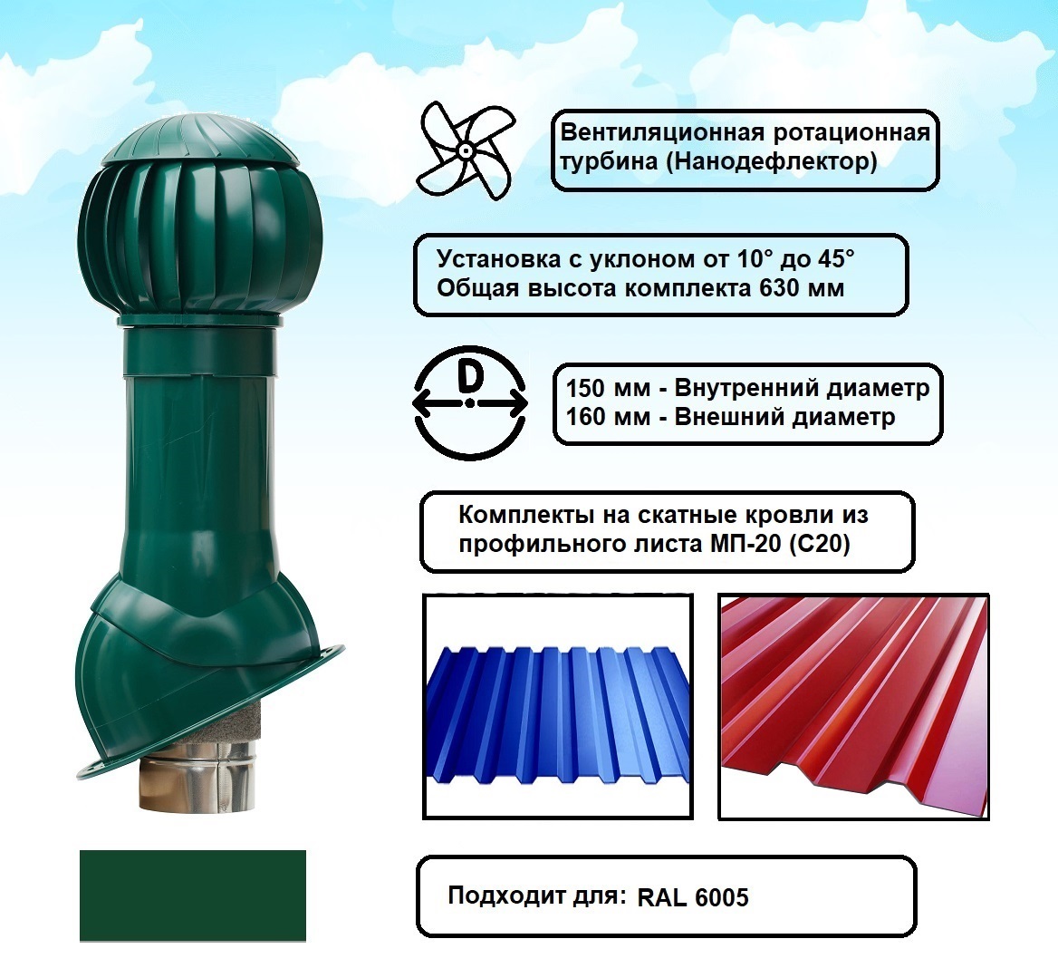 В комплект входит ротационная вентиляционная турбина 160 мм, вентиляционный выход изолированный и проходной элемент для кровли из металлопрофиля МП-20 (С20).