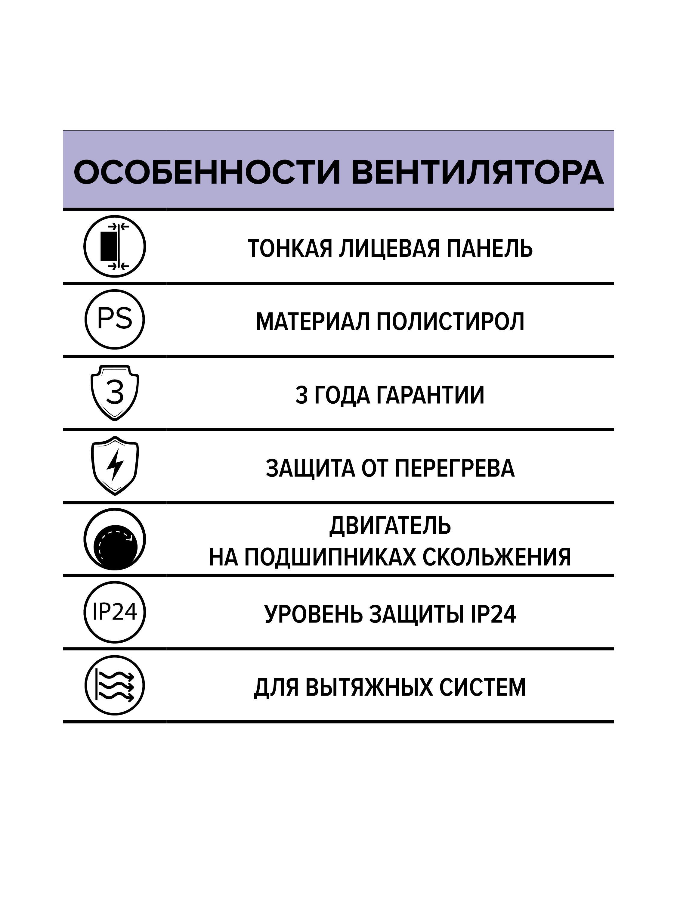 Двигатель на подшипниках скольжения;Полистирол;Тонкая лицевая панель;Защита от мелких частиц и брызг воды;Защита от перегрева;3 года гарантии;Монтаж с помощью саморезов