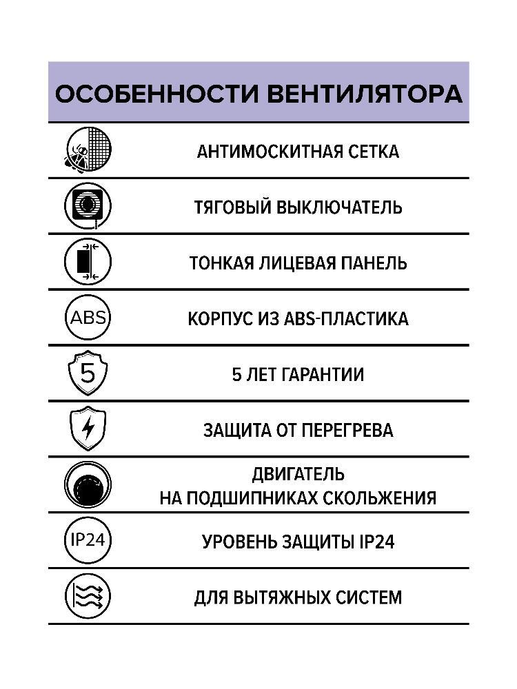 Двигатель на подшипниках скольжения;ABS-пластик;Защита от перегрева;5 лет гарантии;Защита от мелких частиц и брызг воды;Монтаж с помощью саморезов;Тонкая лицевая панель;Антимоскитная сетка