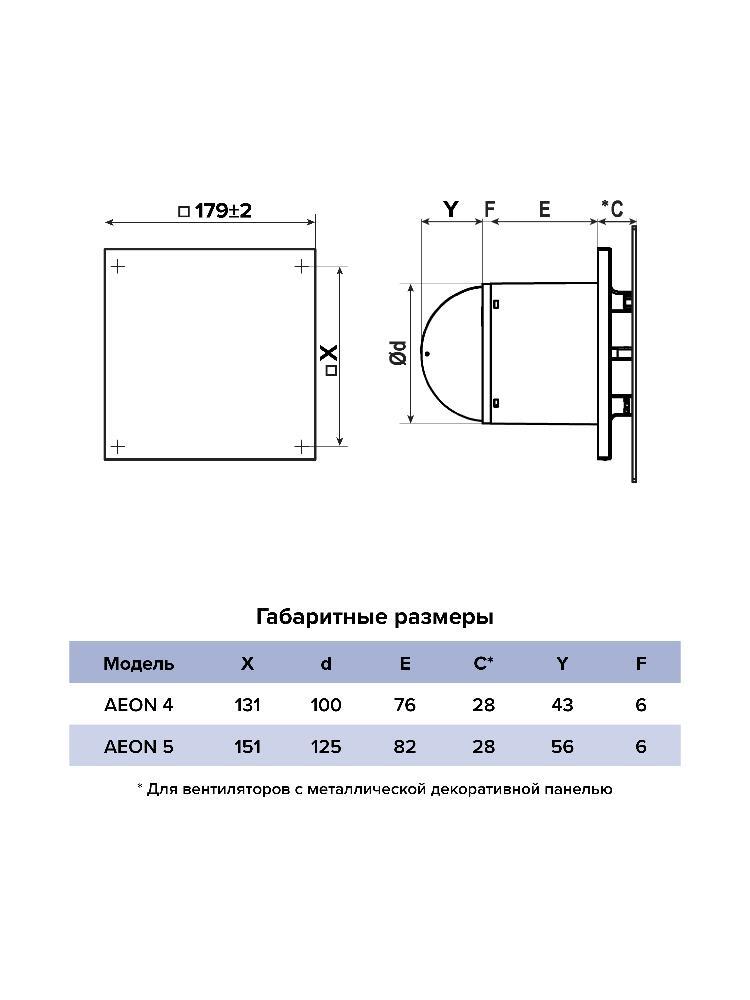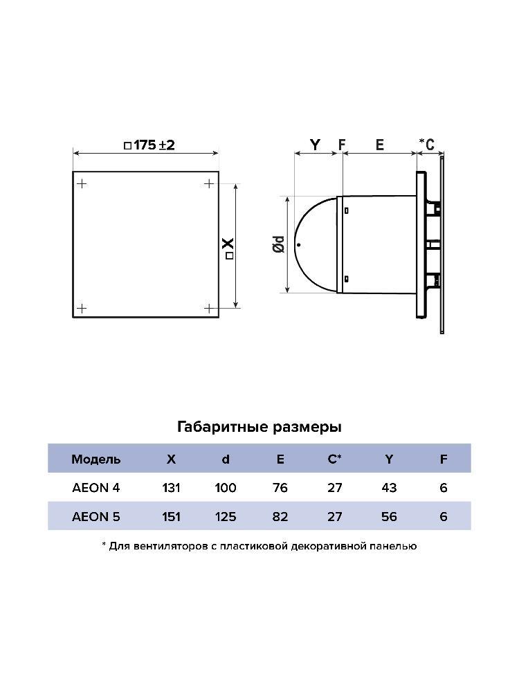 Огромный выбор цветов стильных декоративных накладных панелей из стекла, пластика и металла (приобретаются отдельно) позволяет интегрировать AEON в любой интерьер и обновлять панели при желании, выбирая из разнообразия вариантов. Установка декоративной панели крайне проста: необходимо повернуть декоративную панель на 45°, затем прижать к лицевой панели вентилятора и еще раз повернуть на 45° по часовой стрелке. Таким образом декоративная панель будет надежно зафиксирована. В случае установки вентилятора в потолок необходимо закрепить лицевую панель снизу на корпусе саморезом (входит в комплект).