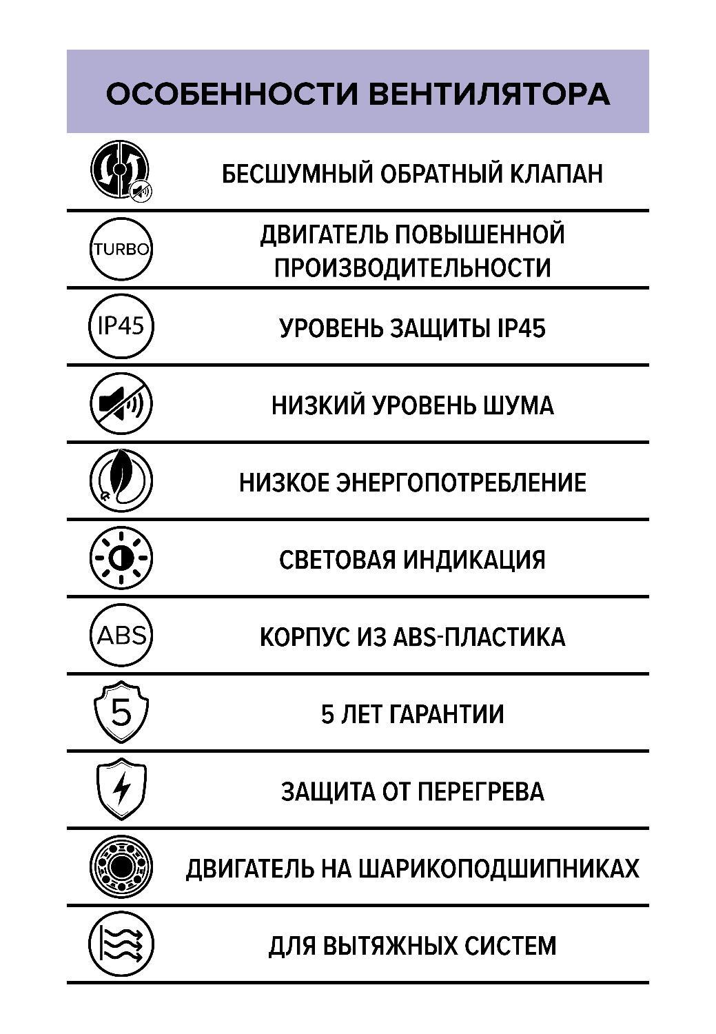 Вентилятор оснащен легкосъемной лицевой панелью, которая фиксируется с помощью защелки и надежно держится на корпусе; обратным клапаном для предотвращения попадания пыли и запахов из вентиляционного канала, индикацией работы в виде мягкой голубой подсветки.