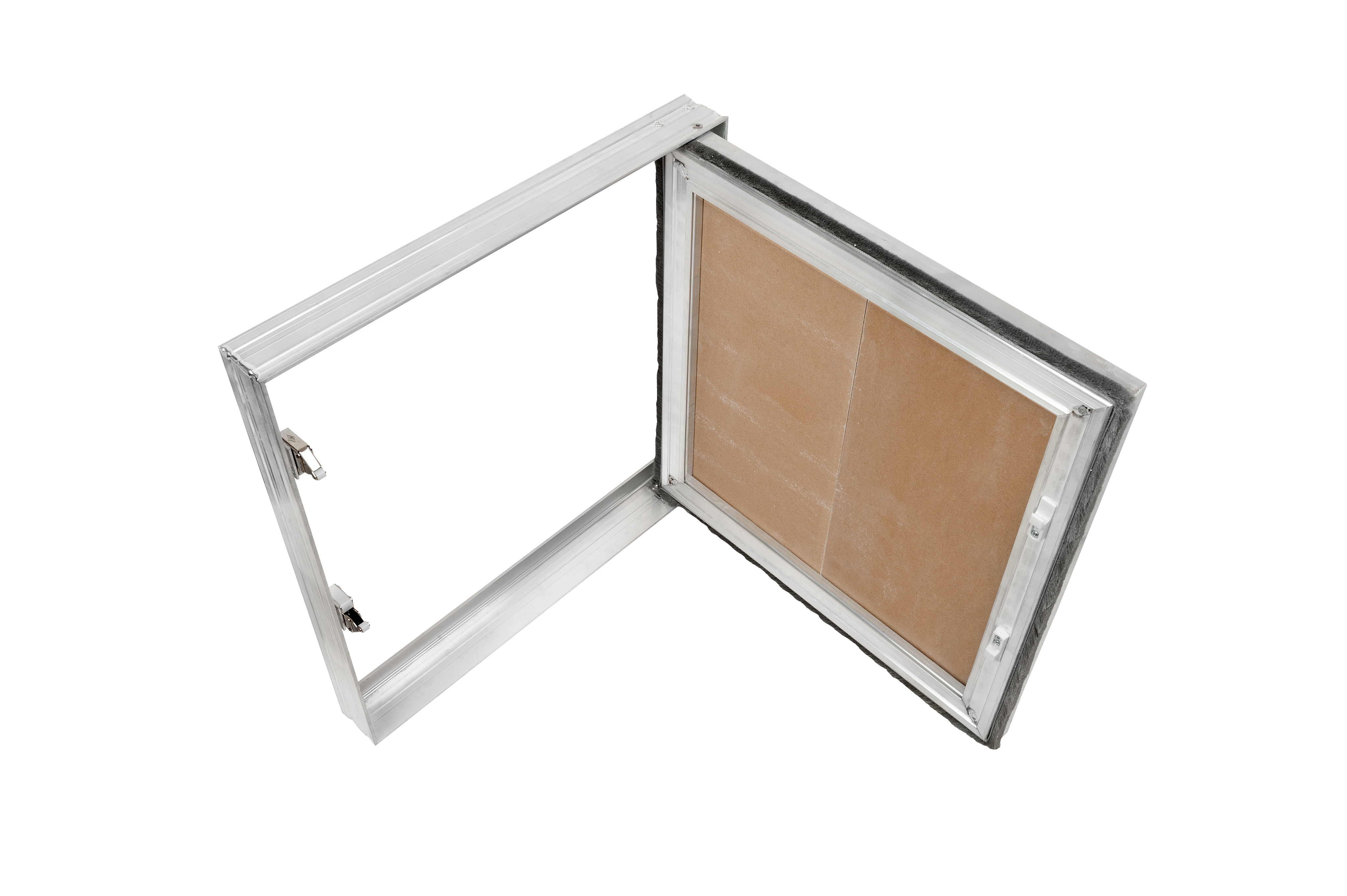 Алюминиевый профиль специальной формы, переменного сечения, делает данную конструкцию прочной и надежной в эксплуатации. Петлевые элементы состоят из специальных металлических закладных деталей из нержавеющей стали, которые позволяют изготавливать данные модели люков Больших размеров и исключают провисание дверцы в петле. Сам петлевой элемент из нержавеющей вытяжной заклепки. Щеточный уплотнитель, вклеенный в дверцу, в специальный хвостовик, защищает от пыли.