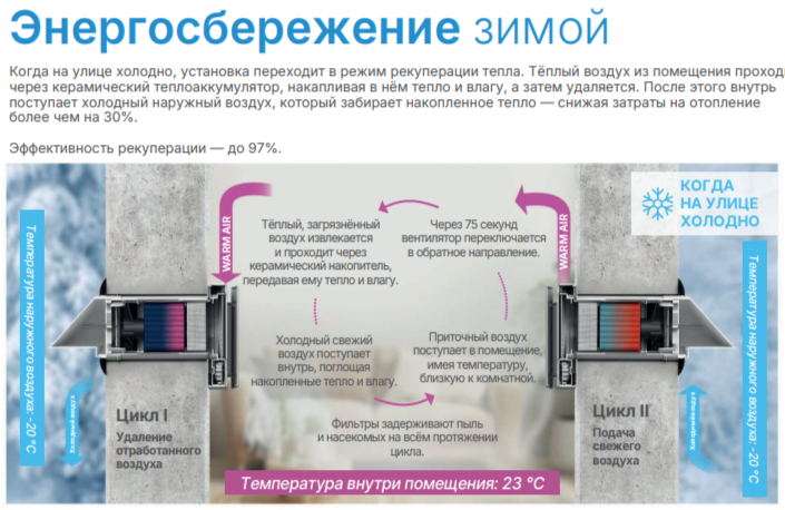 - Фильтр F7 с префильтром и керамический регенератор энергии расположены внутри внутреннего воздуховода.