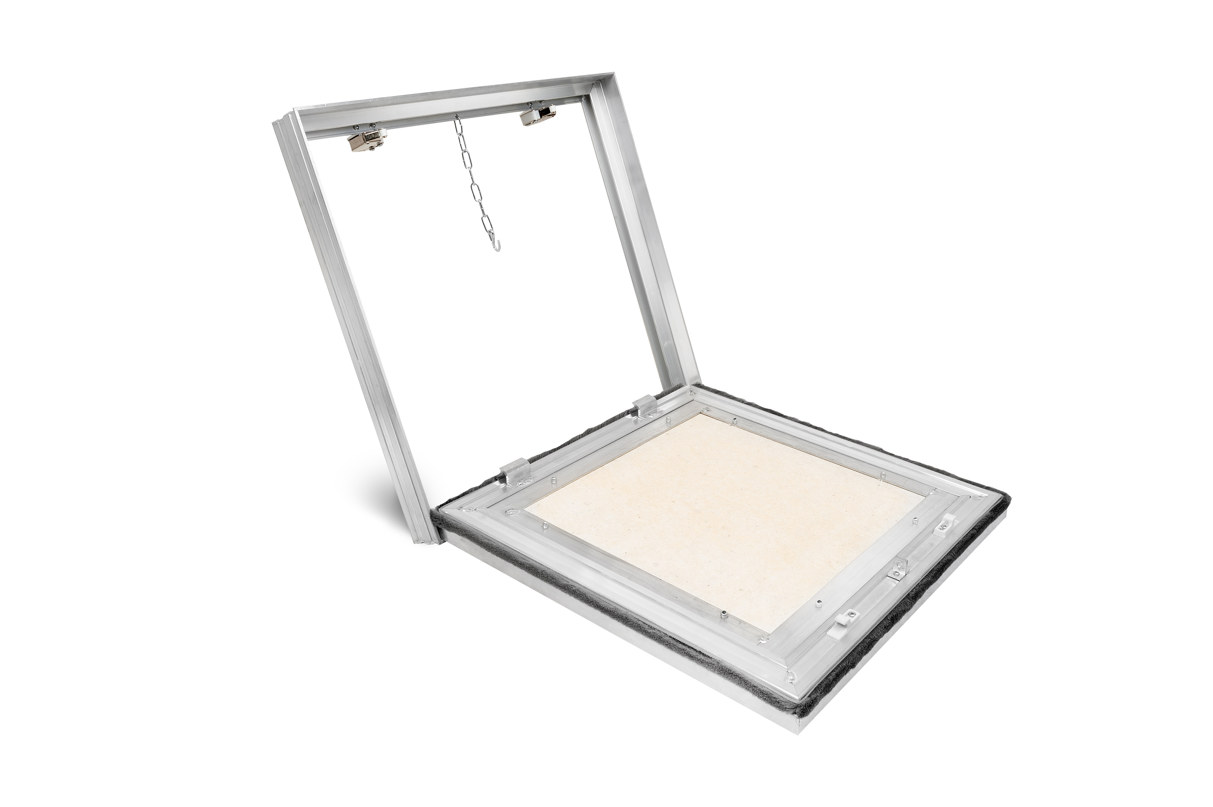 Алюминиевый профиль специальной формы, переменного сечения, разработанный специалистами нашей компании, делает данную конструкцию прочной и надежной в эксплуатации. Щеточный уплотнитель, вклеенный в дверцу, в специальный хвостовик, защищает от пыли. Рамка дверцы из алюминиевого профиля люка модели «Вектор Про Кант» по умолчанию заполняется ГВЛ толщиной 10 мм. При необходимости, по желанию заказчика или особенности отделки модели, возможны следующие изменения и дополнения в конструкцию люка: