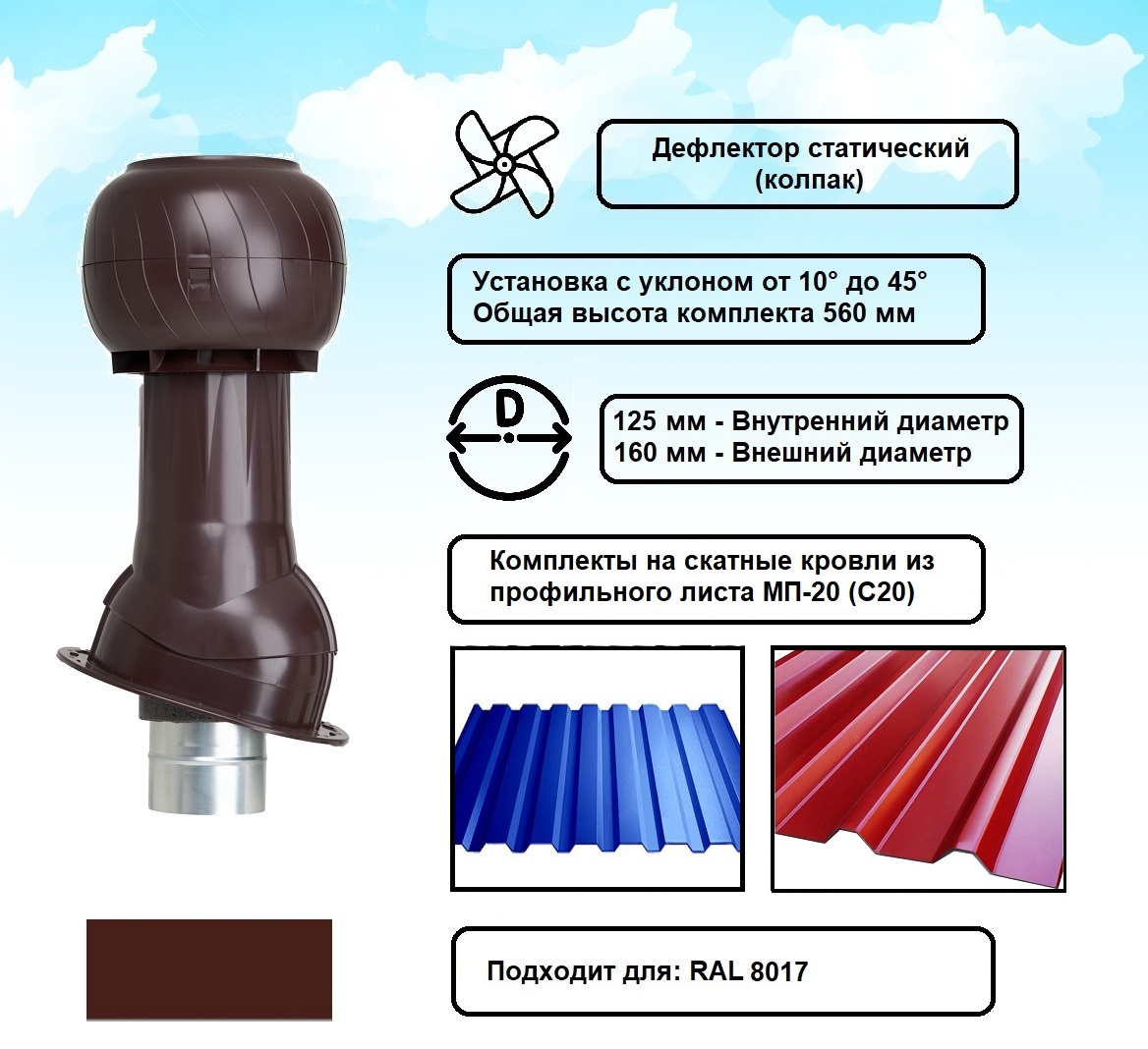 В комплект входит дефлектор статический (колпак вентиляционный) 160 мм (серия: Static), вентиляционный выход изолированный и проходной элемент для кровли из металлопрофиля МП-20 (С20).