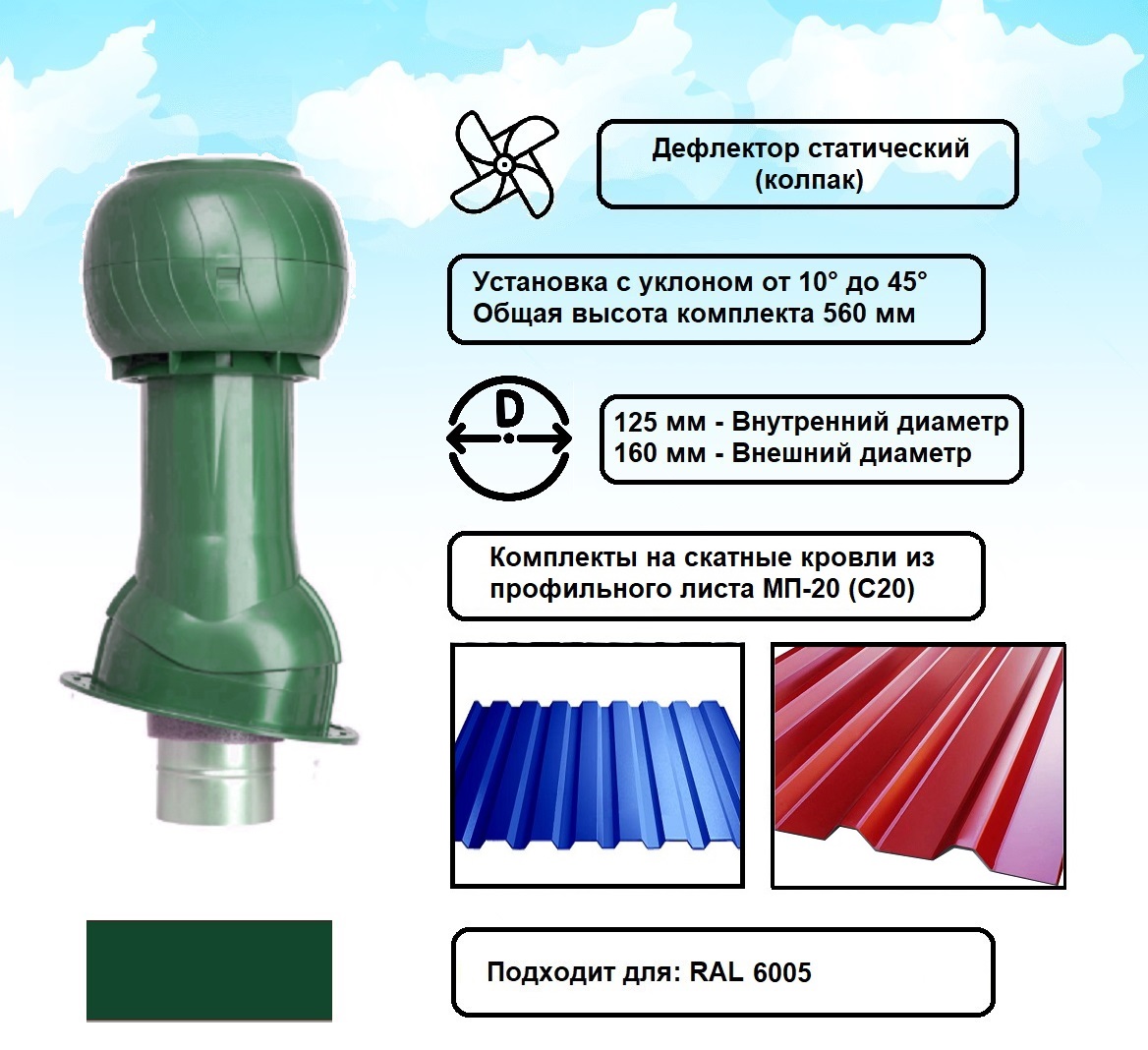Готовый комплект, изолированный на скатные кровли из профильного листа МП-20 (С20) d 125/160 мм, цвет зеленый RAL 6005, серия Static