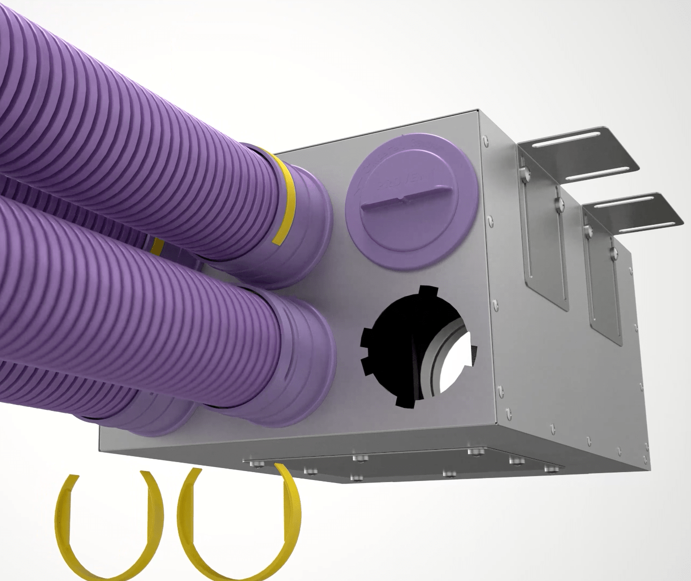 Коллектор устанавливается на четыре монтажных кронштейна (в комплекте). Гибкие воздуховоды Provent RP 75 фиксируются специальными замками Provent LK 75 на присоединительных фланцах (фланцы и замки приобретаются отдельно).