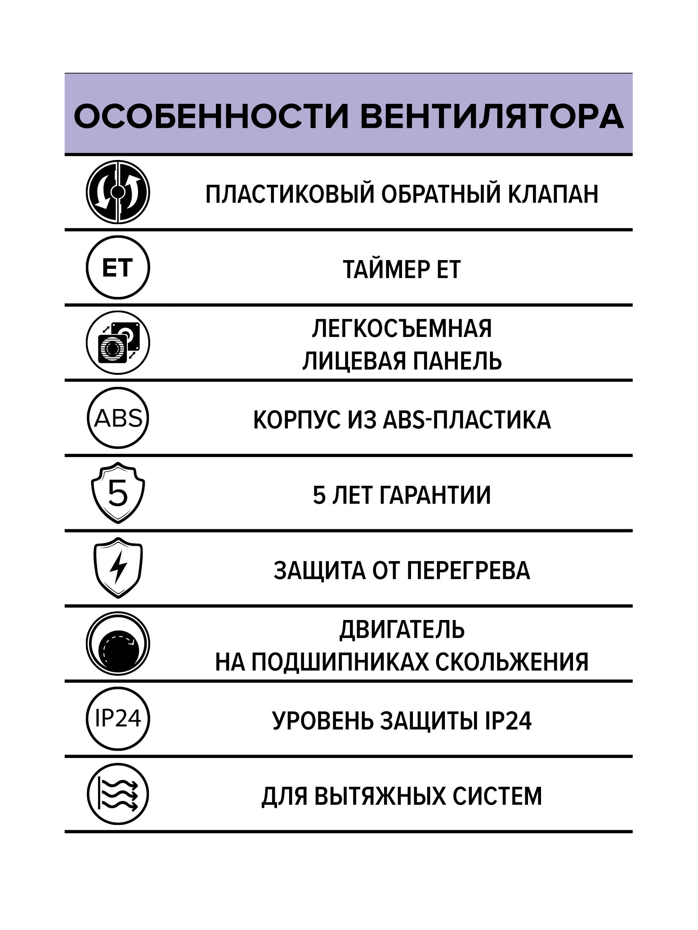 Вентилятор применяется для постоянной и периодической вентиляции санузлов, ванных комнат, кухонь и других бытовых помещений. Вентилятор отвечает самым строгим стандартам качества и безопасности. Уровень защиты – IP24. Двигатель на подшипниках скольжения не требует дополнительного обслуживания и гарантирует эффективное удаление влажного и загрязненного воздуха. Вентилятор оснащен одноразовым предохранителем для предотвращения возникновения короткого замыкания, обратным клапаном для предотвращения попадания пыли и запахов из вентиляционного канала. Благодаря специальной конструкции базы закрытая лицевая панель не мешает вытяжке воздуха из помещения, легко снимается, упрощая очистку вентилятора. Плата управления ET с электронным таймером позволяет настроить время работы с помощью переключателей; интервалы работы 5, 15 или 30 минут. По умолчанию после нажатия на выключатель устройство отработает 30 мин. При необходимости можно изменить интервал работы на 5 или 15 мин., либо отключить таймер. Корпус выполнен из высококачественного и прочного ABS-пластика, который надежно прослужит весь срок использования и не пожелтеет. Монтажный шаблон помогает отметить место для крепления вентилятора. Монтаж осуществляется с помощью саморезов.