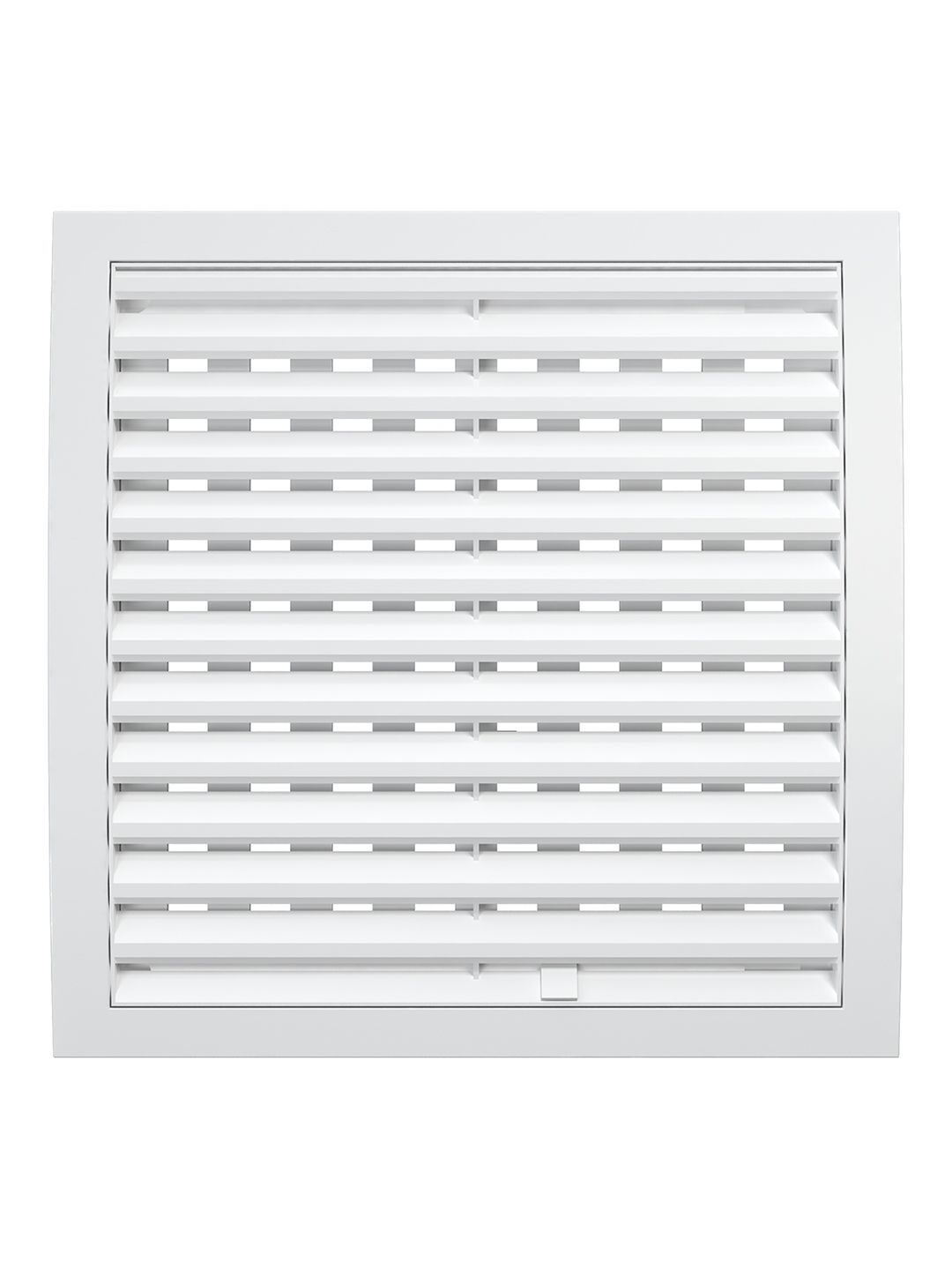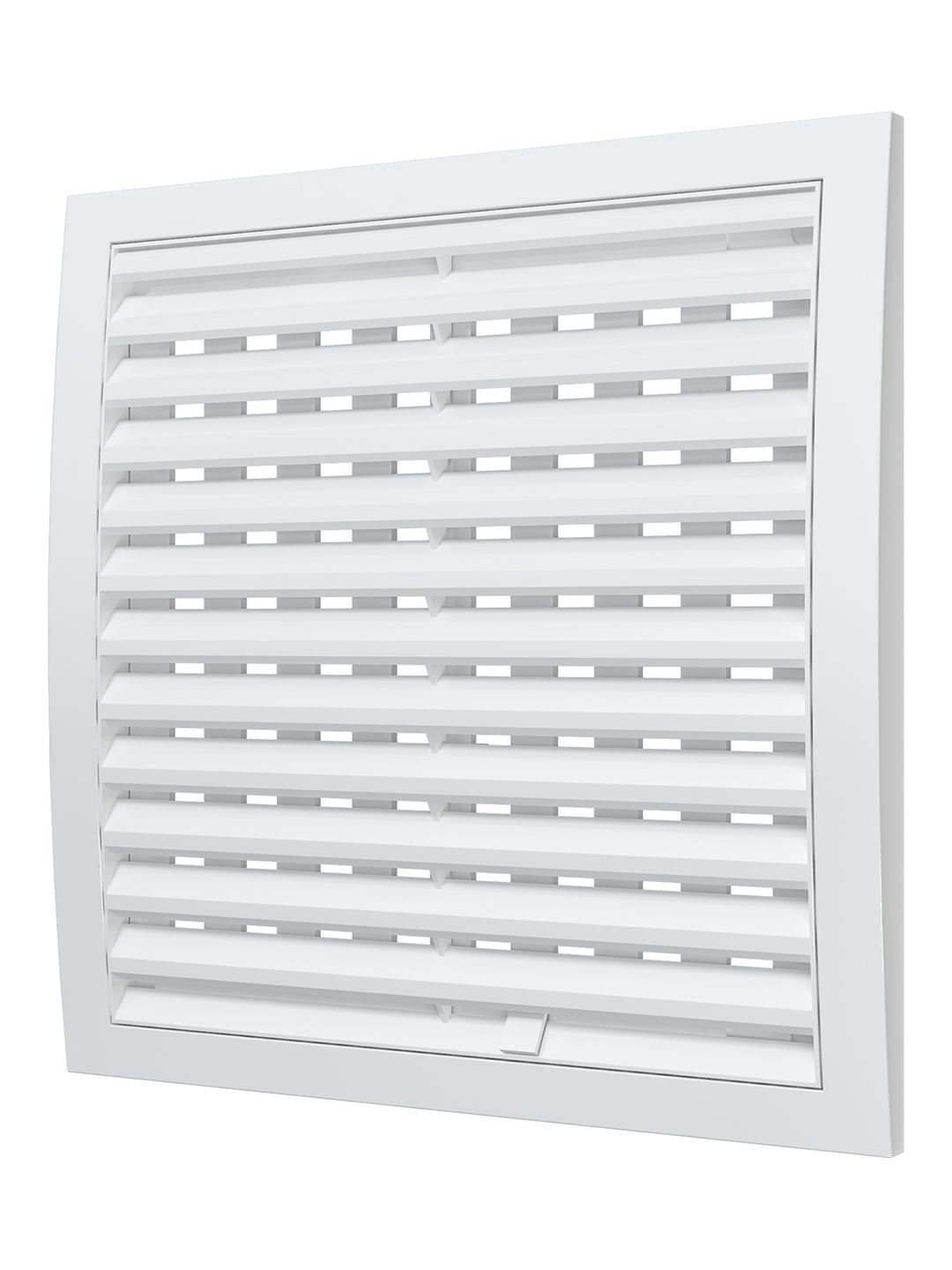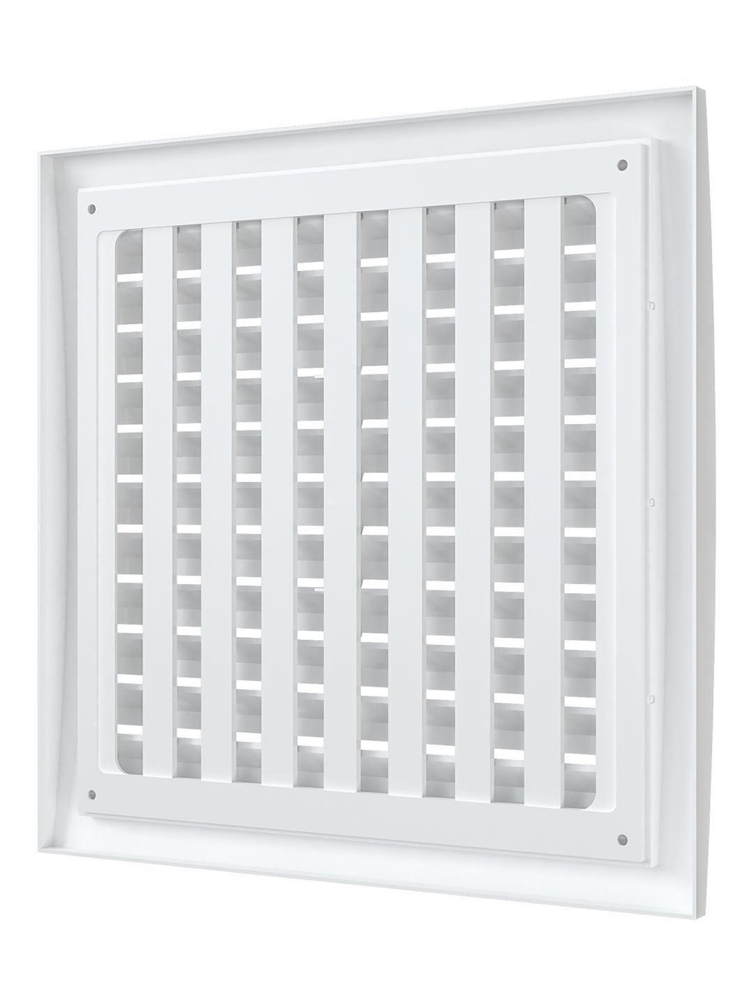 Разъемная решетка РРП оснащена подвижными частями для регулировки потока воздуха, нужное положение выбирается перемещением флажка. Наклонные жалюзи скрывают шахту вентиляции и придают ей эстетичный вид. Доступна в белом цвете и Ivory.