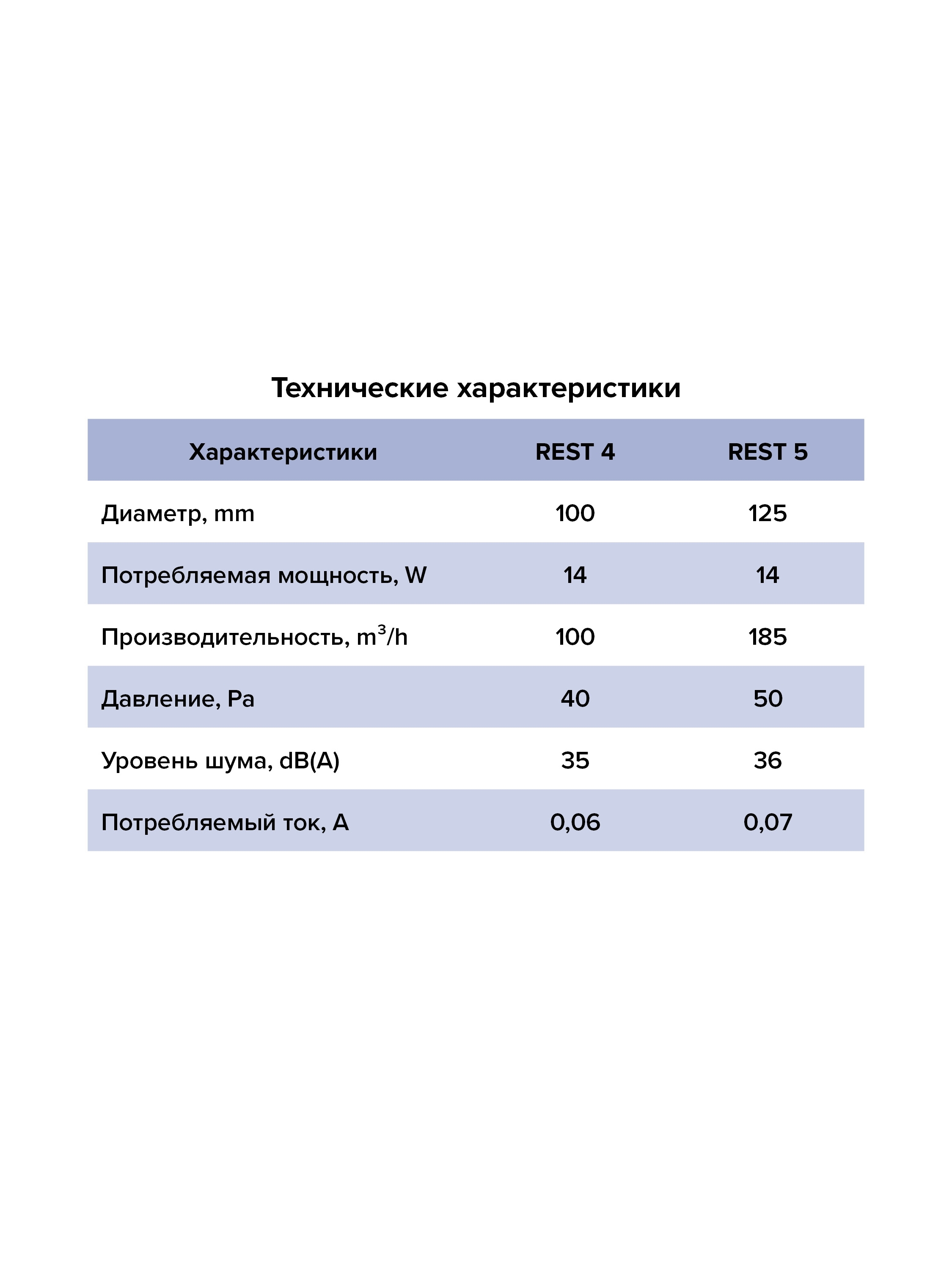 Благодаря высокой производительности (125 м³/ч) REST эффективно вытягивает из помещения влажный воздух и удаляет неприятные запахи.