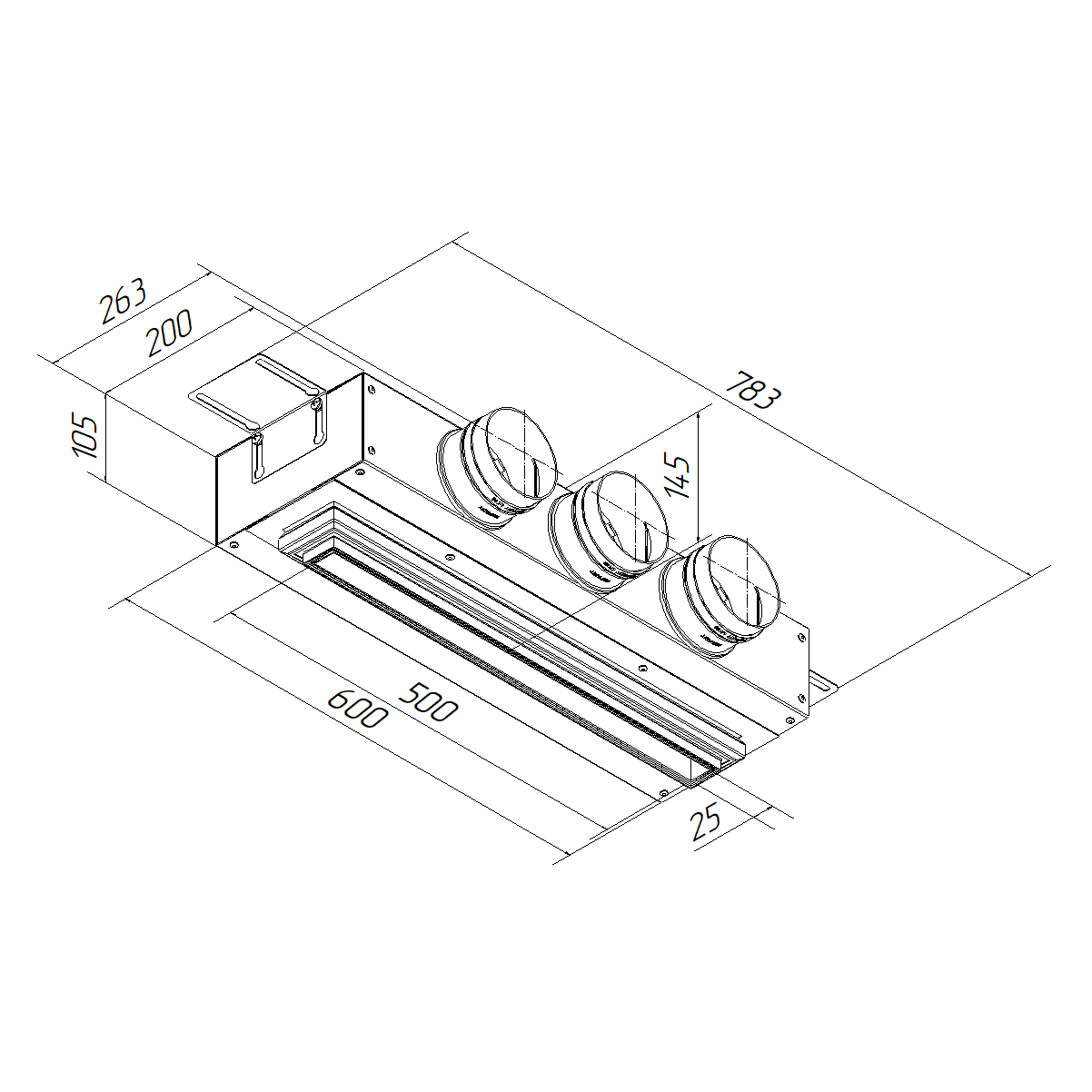 • Размеры (с присоединительными фланцами и диффузором): 600 х 261 х 145 мм