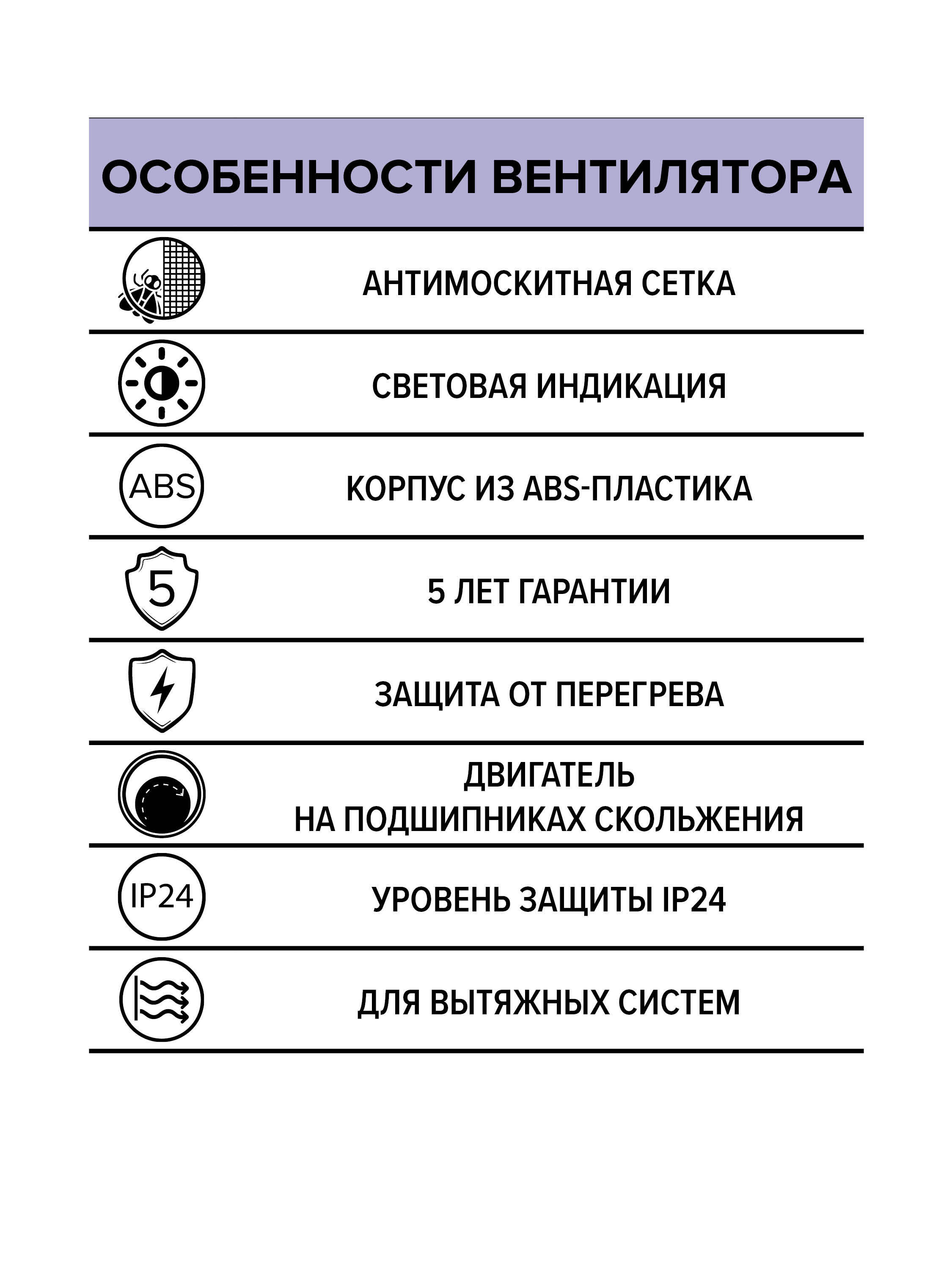 Двигатель на подшипниках скольжения;ABS-пластик;Световая индикация;Защита от перегрева;5 лет гарантии;Защита от мелких частиц и брызг воды;Монтаж с помощью саморезов;Антимоскитная сетка