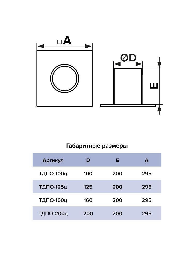 Основание ТДПО используется для соединения прямоугольного отверстия вентиляционного канала с дефлектором соответствующего диаметра. Выполнено из оцинкованной стали, под заказ изготавливается из нержавеющей или окрашенной стали (по палитре RAL). Оснащено круглым патрубком для монтажа с воздуховодами. Крепление осуществляется при помощи саморезов.