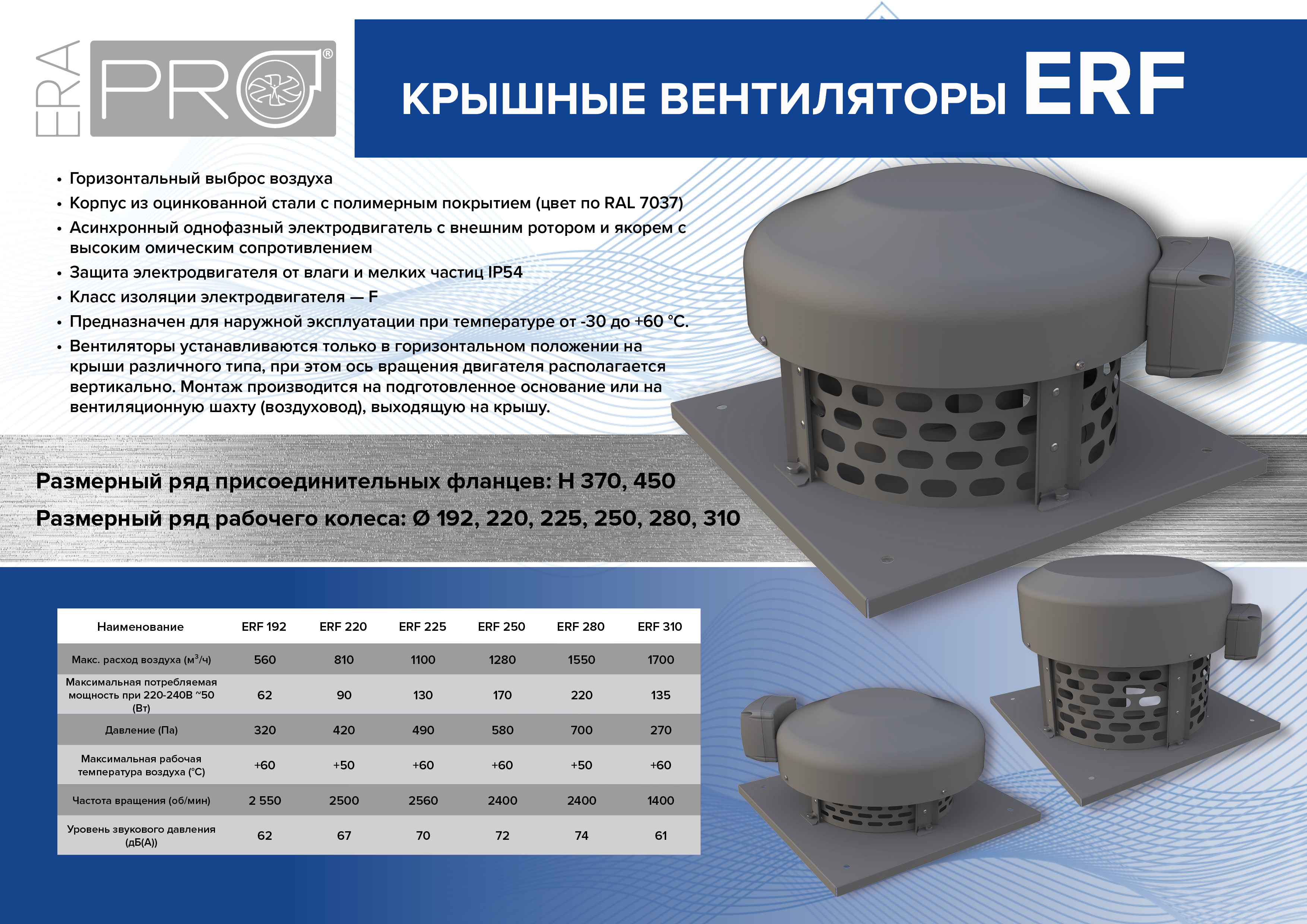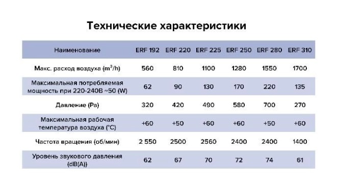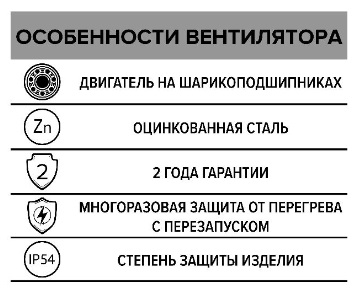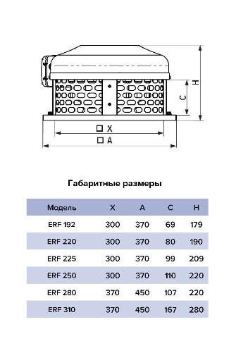 В ERF установлен асинхронный однофазный электродвигатель, который оснащен внешним ротором и якорем с высоким омическим сопротивлением, имеет многоразовую защиту от перегрева с автоматическим перезапуском, защиту от влаги и мелких частиц IP54. Повышенную надежность, долговечность электродвигателя, способность выдерживать высокие температуры обеспечивает изоляция класса F. Корпус вентилятора изготовлен из оцинкованной стали и дополнительно защищен полимерным покрытием от воздействия окружающей среды