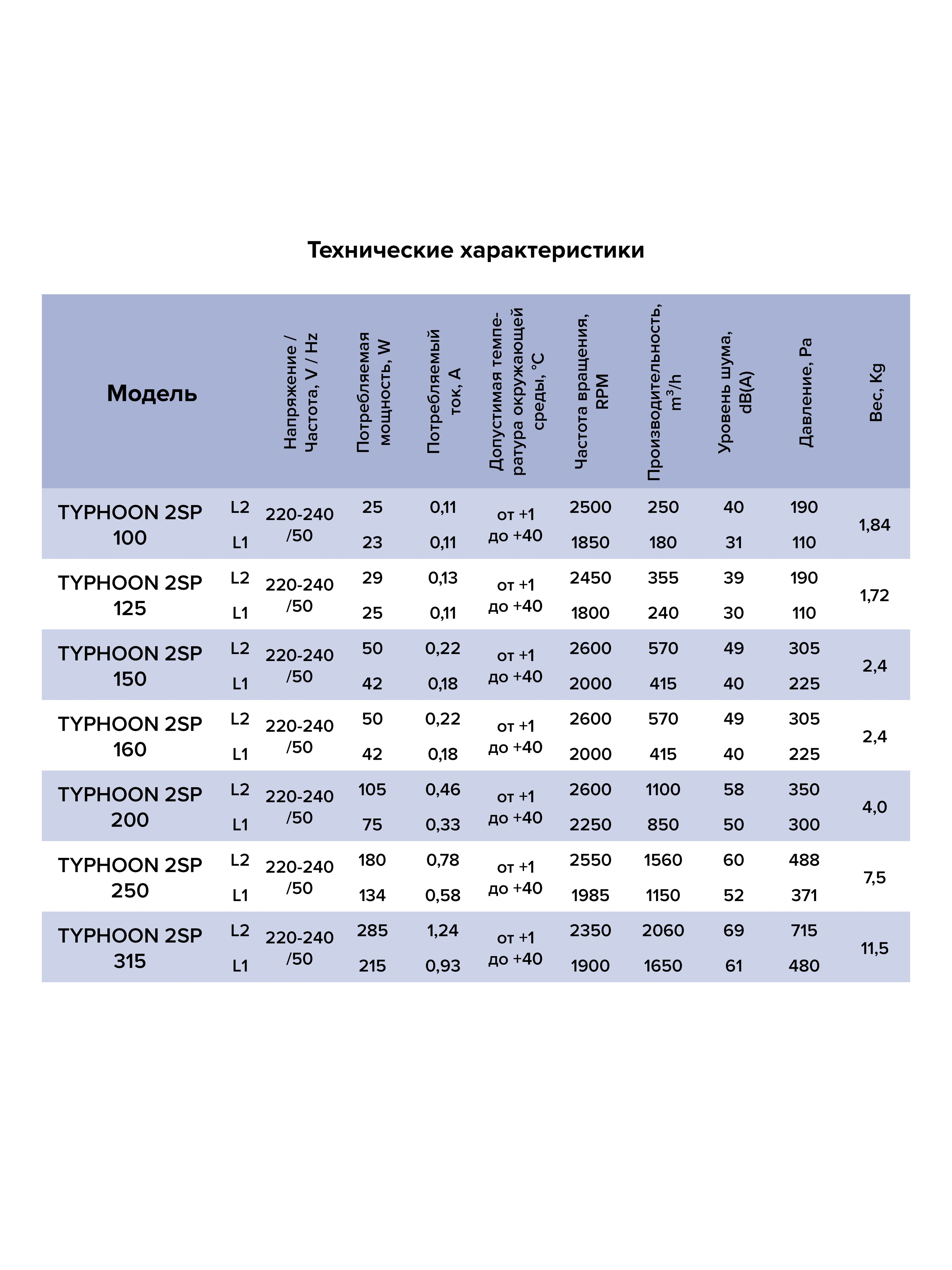 В TYPHOON 100 2SP устанавливается двухскоростной однофазный двигатель на шарикоподшипниках с длительным сроком службы, встроенной тепловой защитой и автоматическим перезапуском. Асимметричная форма клеммной коробки облегчает подключение сетевого провода.