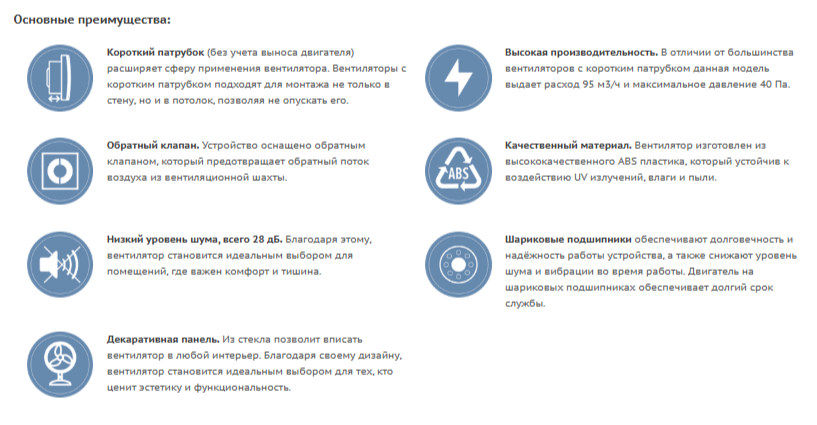 Высокая производительность. В отличии от большинства вентиляторов с коротким патрубком данная модель выдает расход 95 м3/ч и максимальное давление 40 Па.