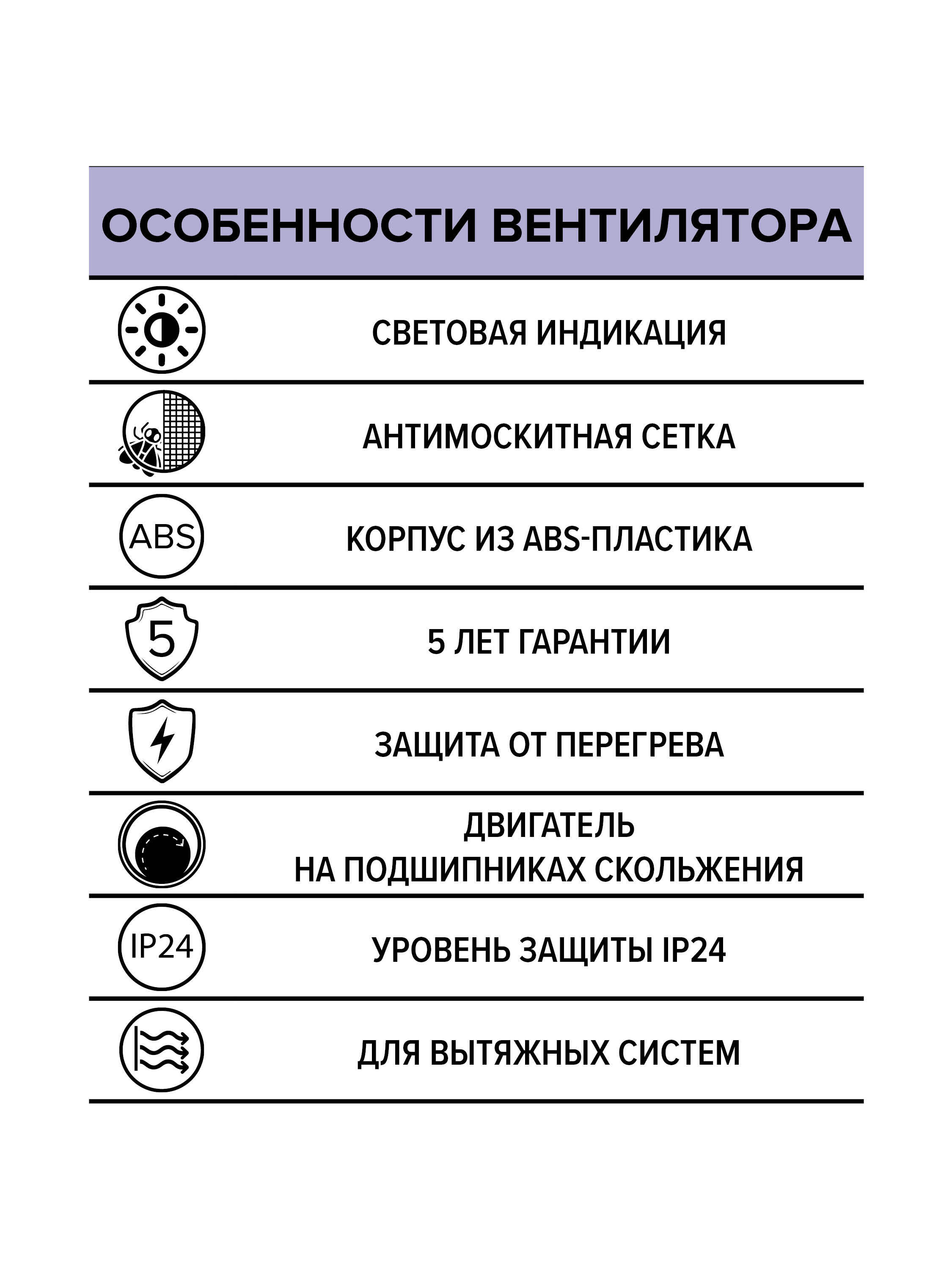 Корпус и крыльчатка выполнены из высококачественного и прочного ABS-пластика, который надежно прослужит весь срок использования и не пожелтеет. На лицевой панели расположен светодиод, который загорается при включении вентилятора.